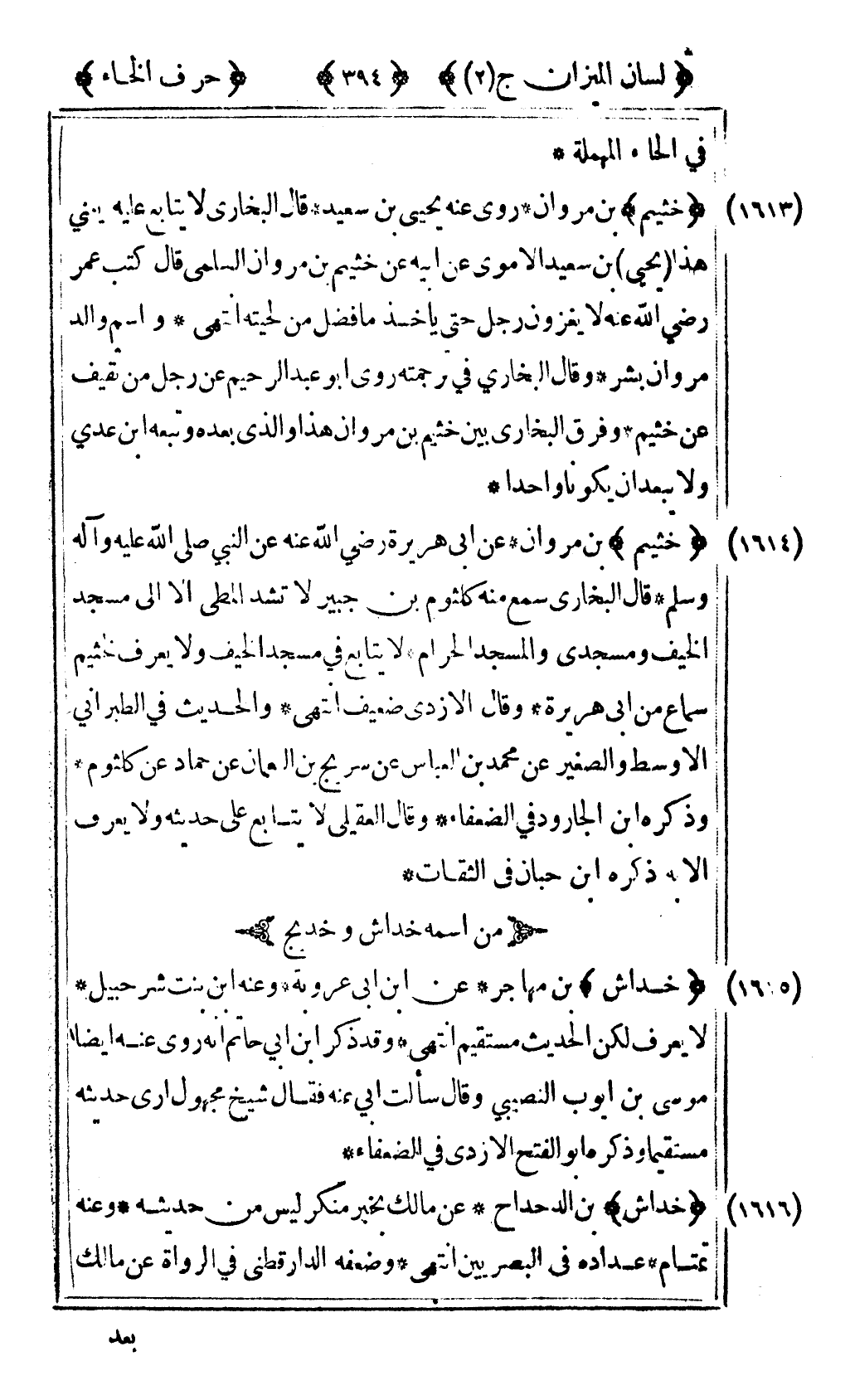 [1614] "خثيم" بن مروان عن أبي هريرة رضى الله عنه عن النبي صلى الله عليه وآله وسلم قال البخاري سمع منه كلثوم بن جبير لا تشد المطي الا الى المسجد الخيف ومسجدي والمسجد الحرام لا يتابع في مسجد الخيف ولا يعرف لخثيم سماع من أبي هريرة وقال الأزدي ضعيف انتهى والحديث في الطبراني الأوسط والصغير عن محمد بن العباس عن سريج بن النعمان عن حماد عن كلثوم وذكره ابن الجارود في الضعفاء وقال العقيلي لا يتابع على حديثه ولا يعرف الا به ذكره ابن حبان في الثقات.