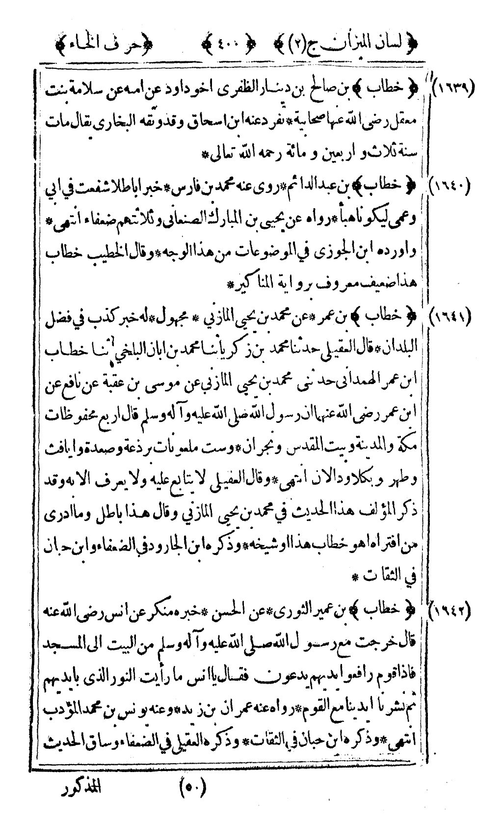 [1641] "خطاب" بن عمر عن محمد بن يحيى المازني مجهول له خبر كذب في فضل البلدان قال العقيلي حدثنا محمد بن زكريا ثنا محمد بن أبان البلخي ثنا خطاب بن عمر الهمداني حدثني محمد بن يحيى المازني عن موسى بن عقبة عن نافع عن ابن عمر رضى الله عنهما ان رسول الله صلى الله عليه وآله وسلم قال "أربع محفوظات مكة والمدينة وبيت المقدس ونجران وست ملعونات برذعة وصعدة وايافث وطهر وبكلا ودالان" انتهى وقال العقيلي لا يتابع عليه ولا يعرف الا به وقد ذكر المؤلف هذا الحديث في محمد بن يحيى المازني وقال هذا باطل وما أدري من افتراه أهو خطاب هذا وشيخه وذكره ابن الجارود في الضعفاء وابن حبان في الثقات.