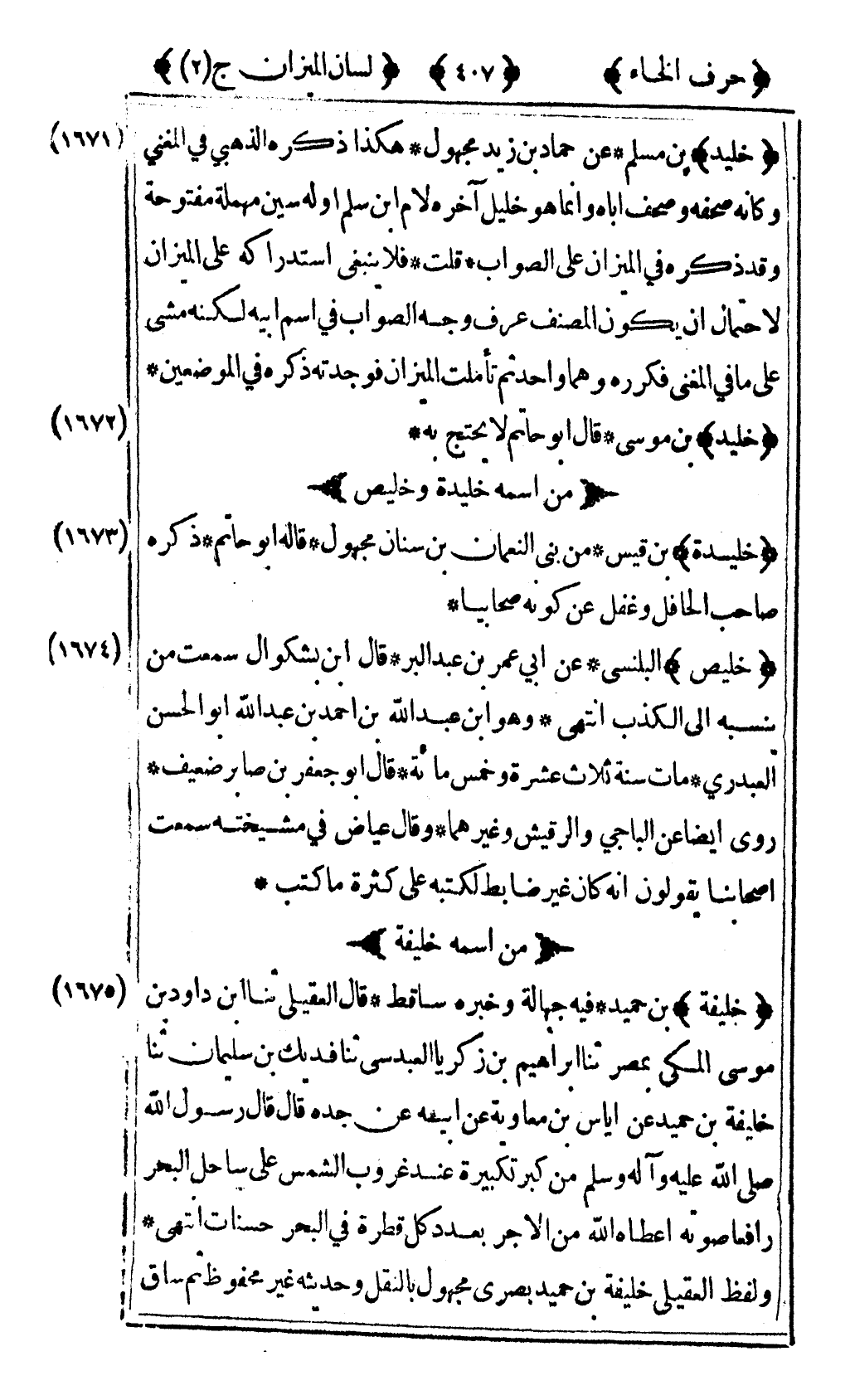 [1671] "خليد" بن مسلم عن حماد بن زيد مجهول هكذا ذكره الذهبي في المغني وكأنه صحفه وصحف أباه وإنما هو خليل آخره لام بن سلم أوله سين مهملة مفتوحة وقد ذكره في الميزان على الصواب قلت فلا ينبغي استدراكه على الميزان لاحتمال أن يكون المصنف عرف وجه الصواب في اسم أبيه لكنه مشى على ما في المغني فكرره وهما واحد ثم تأملت الميزان فوجدته ذكره في الموضعين.
