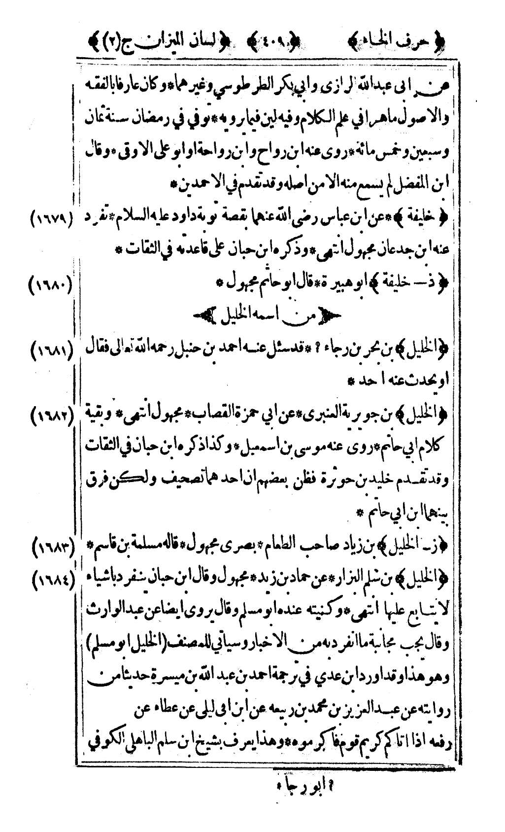 [1681] "الخليل" بن بحر بن رجاء1 قد سئل عنه أحمد بن حنبل رحمه الله تعالى فقال أو يحدث عنه أحد.