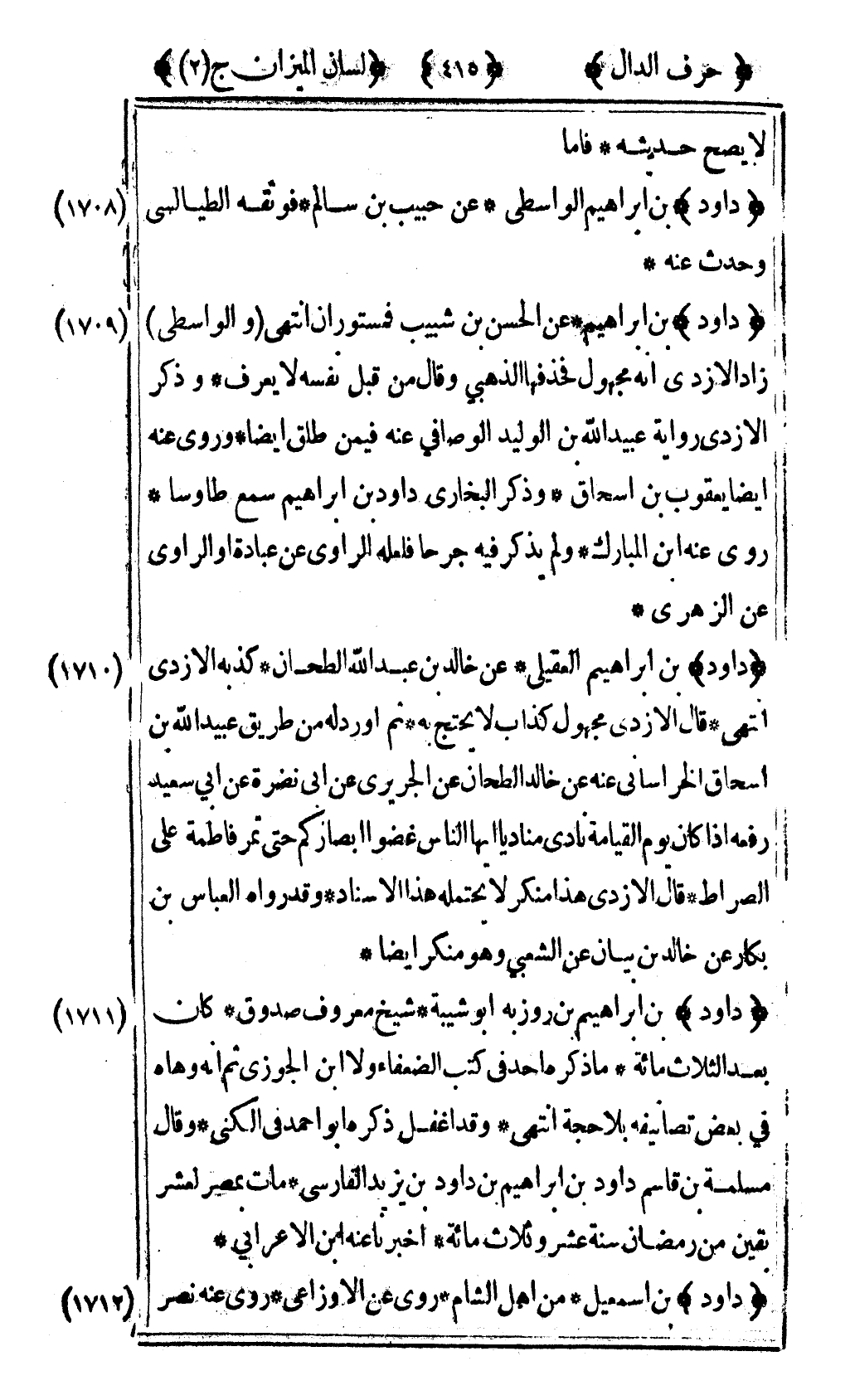 [1708] "داود" بن إبراهيم الواسطي عن حبيب بن سالم فوثقه الطيالسي وحدث عنه.