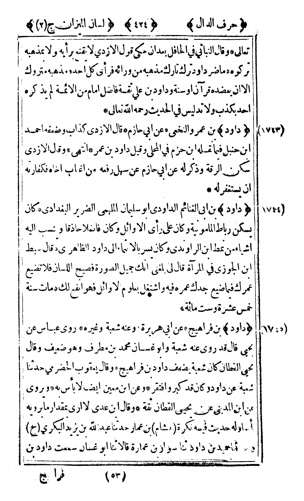 [1745] "داود" بن فراهيج عن أبي هريرة وعنه شعبة وغيره روى عباس عن يحيى قال قد روى عنه شعبة وأبو غسان محمد بن مطرف وهو ضعيف وقال يحيى القطان كان شعبة يضعف داود بن فراهيج وقال يعقوب الحضرمي حدثنا شعبة عن داود وكان قد كبر وافتقر وعن ابن معين أيضا لا بأس به ويروي عن ابن المديني عن يحيى القطان ثقة وقال ابن عدي لا أرى بمقدار ما يرويه بأسا وله حديث فيه نكرة هشام بن عمار حدثنا عبد الله ابن يزيد البكري ح وحدثنا حميد بن داود ثنا سوار بن عمارة قالا ثنا أبو غسان سمعت داود بن