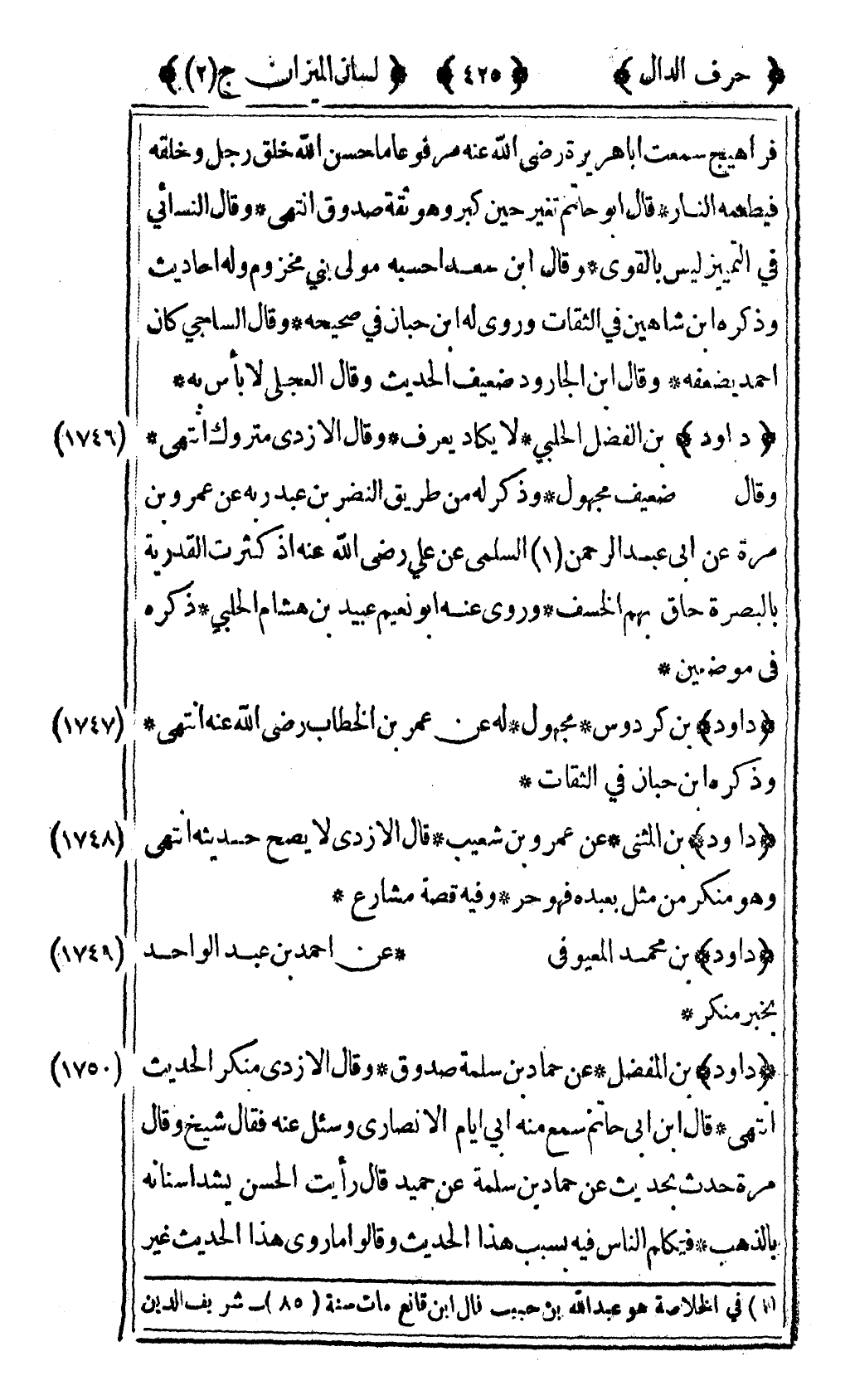 [1746] "داود" بن الفضل الحلبي لا يكاد يعرف وقال الأزدي متروك انتهى وقال ضعيف مجهول وذكر له من طريق النضر بن عبد ربه عن عمرو بن مرة عن أبي عبد الرحمن1 السلمي عن علي رضى الله عنه إذ كثرت القدرية بالبصرة حاق بهم الخسف وروى عنه أبو نعيم عبيد بن هشام الحلبي ذكره في موضعين.