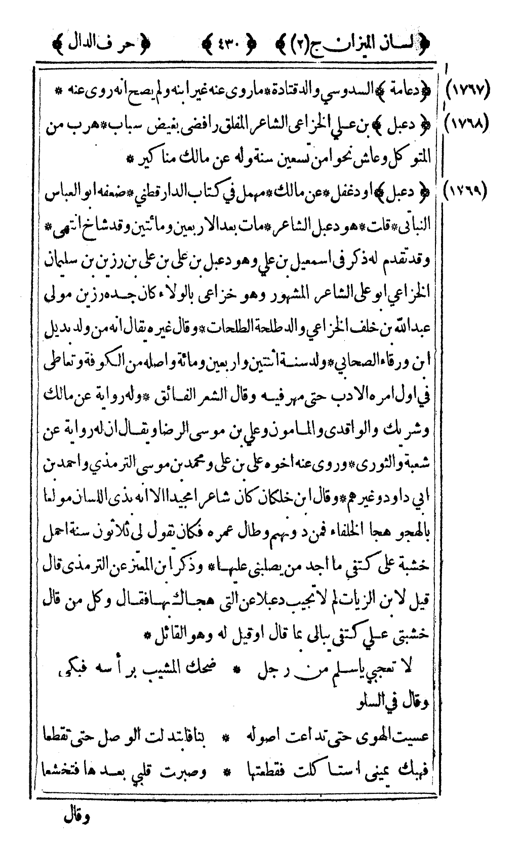 [1769] "دعبل" أو دغفل عن مالك مهمل في كتاب الدارقطني ضعفه أبو العباس النباتي قلت هو دعبل الشاعر مات بعد الأربعين ومائتين وقد شاخ انتهى وقد تقدم له ذكر في إسماعيل بن علي وهو دعبل بن علي بن علي بن رزين بن سليمان عثمان الخزاعي أبو علي الشاعر المشهور وهو خزاعي بالولاء كان جده رزين مولى عبد الله ابن خلف الخزاعي والد طلحة الطلحات وقال غيره يقال أنه من ولد بديل بن ورقاء الصحابي ولد سنة اثنتين وأربعين ومائة وأصله من الكوفة وتعاطى في أول أمره الأدب حتى مهر فيه وقال الشعر الفائق وله رواية عن مالك وشريك والواقدي والمأمون وعلي بن موسى الرضا ويقال أن له رواية عن شعبة والثوري وروى عنه أخوه علي بن علي ومحمد بن موسى الترمذي وأحمد بن أبي داود وغيرهم وقال ابن خلكان كان شاعرا مجيدا الا أنه بذيء اللسان مولعا بالهجو هجا الخلفاء فمن دونهم وطال عمره فكان يقول لي ثلاثون سنة أحمل خشبة على كتفي ما أجد من يصلبني عليها وذكر ابن المعتز عن الترمذي قال قيل لابن الزيات لما لا تجيب دعبلا عن التي هجاك بها فقال وكل من قال خشبتي علي كتفي يبالي بما قال أو قيل له وهو القائل: