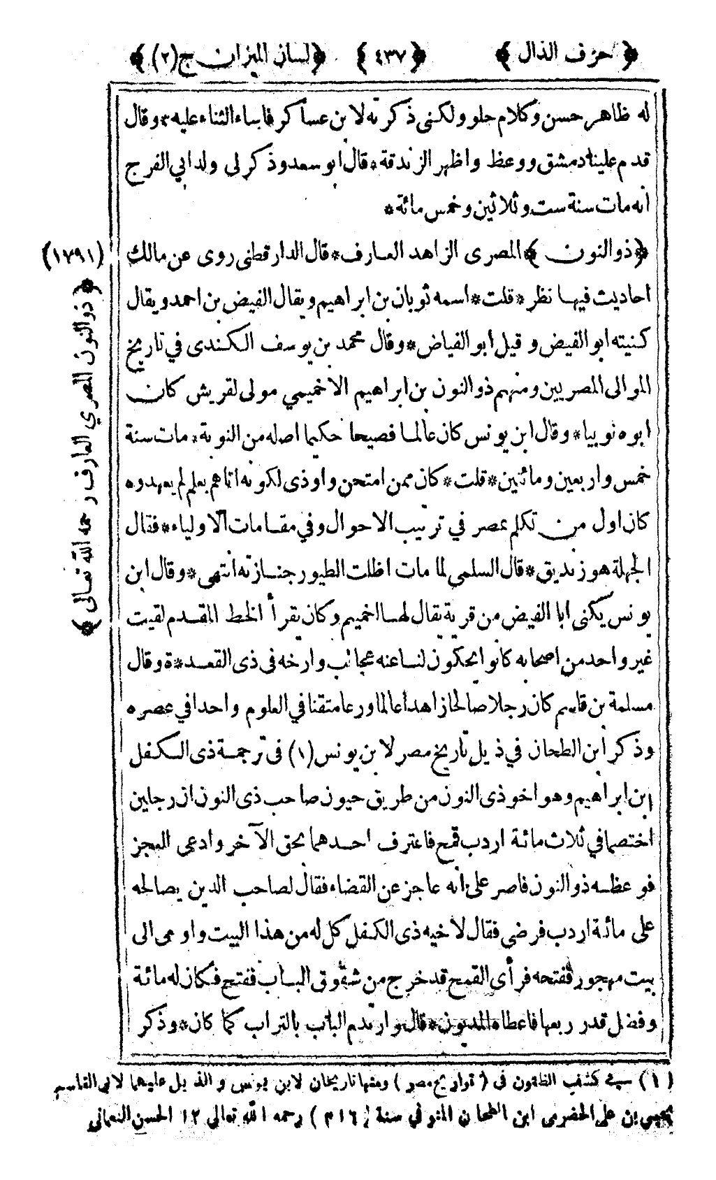 [1791] "ذو النون" المصري الزاهد العارف قال الدارقطني روى عن مالك أحاديث فيها نظر قلت اسمه ثوبان بن إبراهيم ويقال الفيض بن أحمد ويقال كنيته أبو الفيض وقيل أبو الفياض وقال محمد بن يوسف الكندي في تاريخ الموالي المصريين ومنهم ذو النون بن إبراهيم الأخميمي مولى لقريش كان أبوه نوبيا وقال ابن يونس كان عالما فصيحا حكيما أصله من النوبة مات سنة خمس وأربعين ومائتين قلت كان ممن امتحن وأوذي لكونه أتاهم بعلم لم يعهدوه كان أول من تكلم بمصر في ترتيب الأحوال وفي مقامات الأولياء فقال الجهلة هو زنديق قال السلمي لما مات أظلت الطيور جنازته انتهى وقال ابن يونس يكنى أبا الفيض من قرية يقال لها اخميم وكان يقرأ الخط المقدم لقيت غير واحد من أصحابه كانوا يحكون لنا عنه عجائب وأرخه في ذي القعدة وقال مسلمة بن قاسم كان رجلا صالحا زاهدا عالما ورعا متقنا في العلوم واحدا في عصره وذكر ابن الطحان في ذيل تاريخ مصر لابن يونس1 في ترجمة ذي الكفل بن إبراهيم وهو أخو ذي النون من طريق حيون صاحب ذي النون أن رجلين اختصما في ثلاث مائة أردب قمح فاعترف أحدهما بحق الآخر وادعى العجز فوعظه ذو النون فأصر على أنه عاجز عن القضاء فقال لصحاب الدين يصالحه على مائة أردب فرضي فقال لأخيه ذي الكفل كل له من هذا البيت وأومىء الى بيت مهجور ففتحه فرأى القمح قد خرج من شقوق الباب ففتح فكان له مائة وفضل قدر ربعها فأعطاه المديون قال وارتدم الباب بالتراب كما كان وذكر