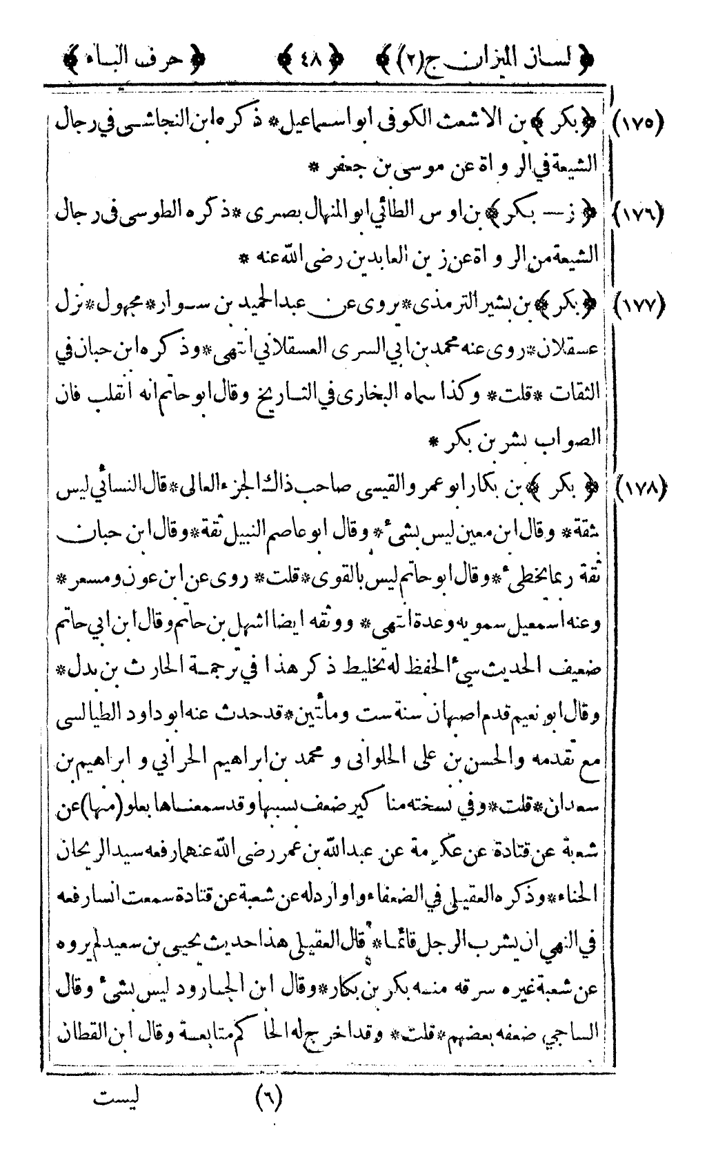 [177] "بكر" بن بشير الترمذي يروي عن عبد الحميد بن سوار مجهول نزل عسقلان روى عنه محمد بن أبي السري العسقلاني انتهى وذكره ابن حبان في الثقات قلت وكذا سماه البخاري في التاريخ وقال أبو حاتم انه انقلب فإن الصواب بشر بن بكر.