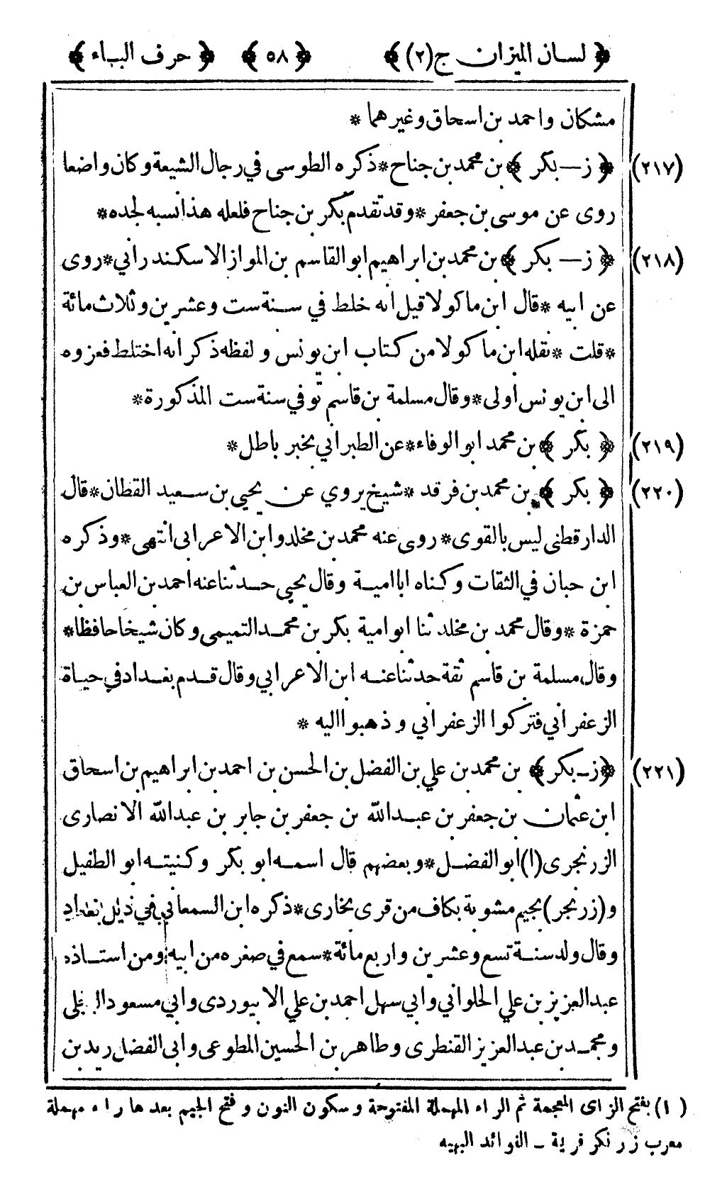 [217] "ز- بكر" بن محمد بن جناح ذكره الطوسي في رجال الشيعة وكان واضعا روى عن موسى بن جعفر وقد تقدم بكر بن جناح فلعله هذا نسبه لجده.