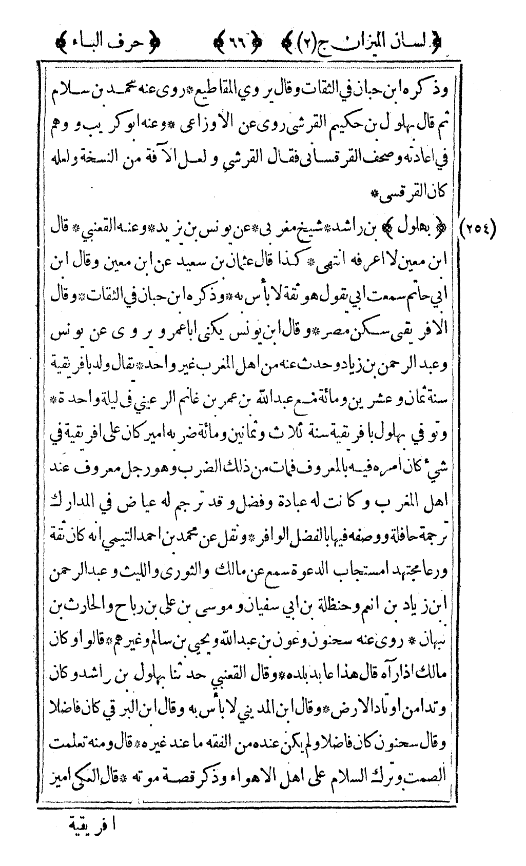 [254] "بهلول" بن راشد شيخ مغربي عن يونس بن يزيد وعنه القعنبي قال ابن معين لا أعرفه انتهى كذا قال عثمان بن سعيد عن ابن معين وقال ابن حاتم سمعت أبي يقول هو ثقة لا باس به وذكره ابن حبان في الثقات وقال الإفريقي سكن مصر وقال ابن يونس يكنى أبا عمرو يروي عن يونس وعبد الرحمن بن زياد وحدث عنه من أهل المغرب غير واحد يقال ولد بإفريقية سنة ثمان وعشرين ومائة مع عبد الله ابن عمر بن غانم الرعيني في ليلة واحدة وتوفي بهلول بإفرقية سنة ثلاث وثمانين ومائة ضربه أمير كان على إفريقية في شيء كان أمره فيه بالمعروف فمات من ذلك الضرب وهو رجل معروف عند أهل المغرب وكانت له عبادة وفضل وقد ترجم له عياض في المدارك ترجمة حافلة ووصفه فيها بالفضل الوافر ونقل عن محمد بن أحمد التيمي أنه كان ثقة ورعا مجتهدا مستجاب الدعوة سمع عن مالك والثوري والليث وعبد الرحمن بن زياد بن أنعم وحنظلة بن أبي سفيان وموسى بن علي بن رباح والحارث بن نبهان روى عنه سحنون وعون بن عبد الله ويحيى بن سالم وغيرهم قالوا وكان مالك إذا رآه قال هذا عابد بلده وقال القعنبي حدثنا بهلول بن راشد وكان وتدا من أوتاد الأرض وقال ابن المديني لا بأس به وقال ابن البرقي كان فاضلا وقال سحنون كان فاضلا ولم يكن عنده من الفقه ما عند غيره قال ومنه تعلمت الصمت وترك السلام على أهل الأهواء وذكر قصة موته قال العكي أمير