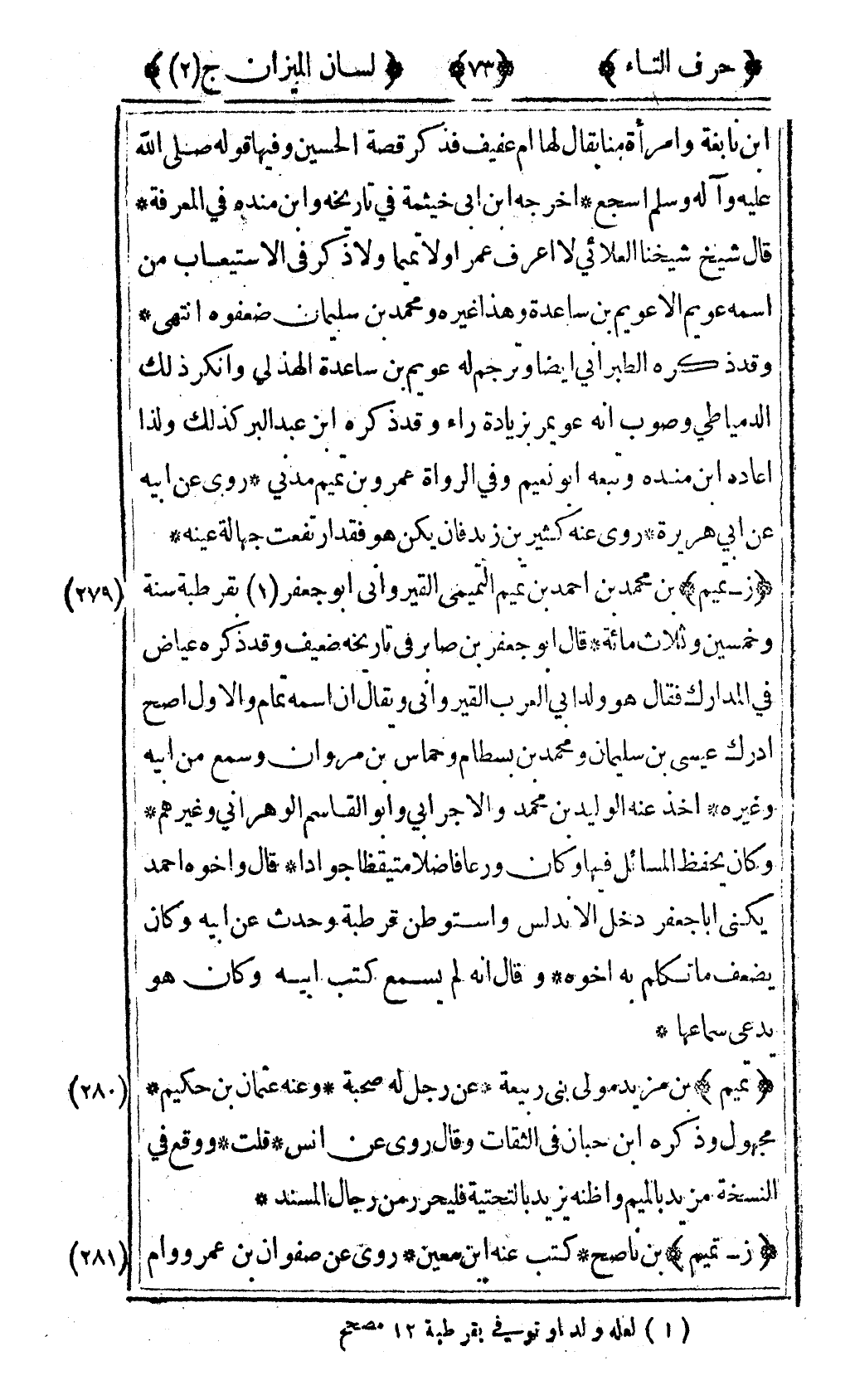 [280] "تميم" بن مزيد مولى بني ربيعة عن رجل له صحبة وعنه عثمان بن حكيم مجهول وذكره ابن حبان في الثقات وقال روى عن أنس قلت ووقع في النسخة مزيد بالميم وأظنه يزيد بالتحتية فليحرر من رجال المسند.