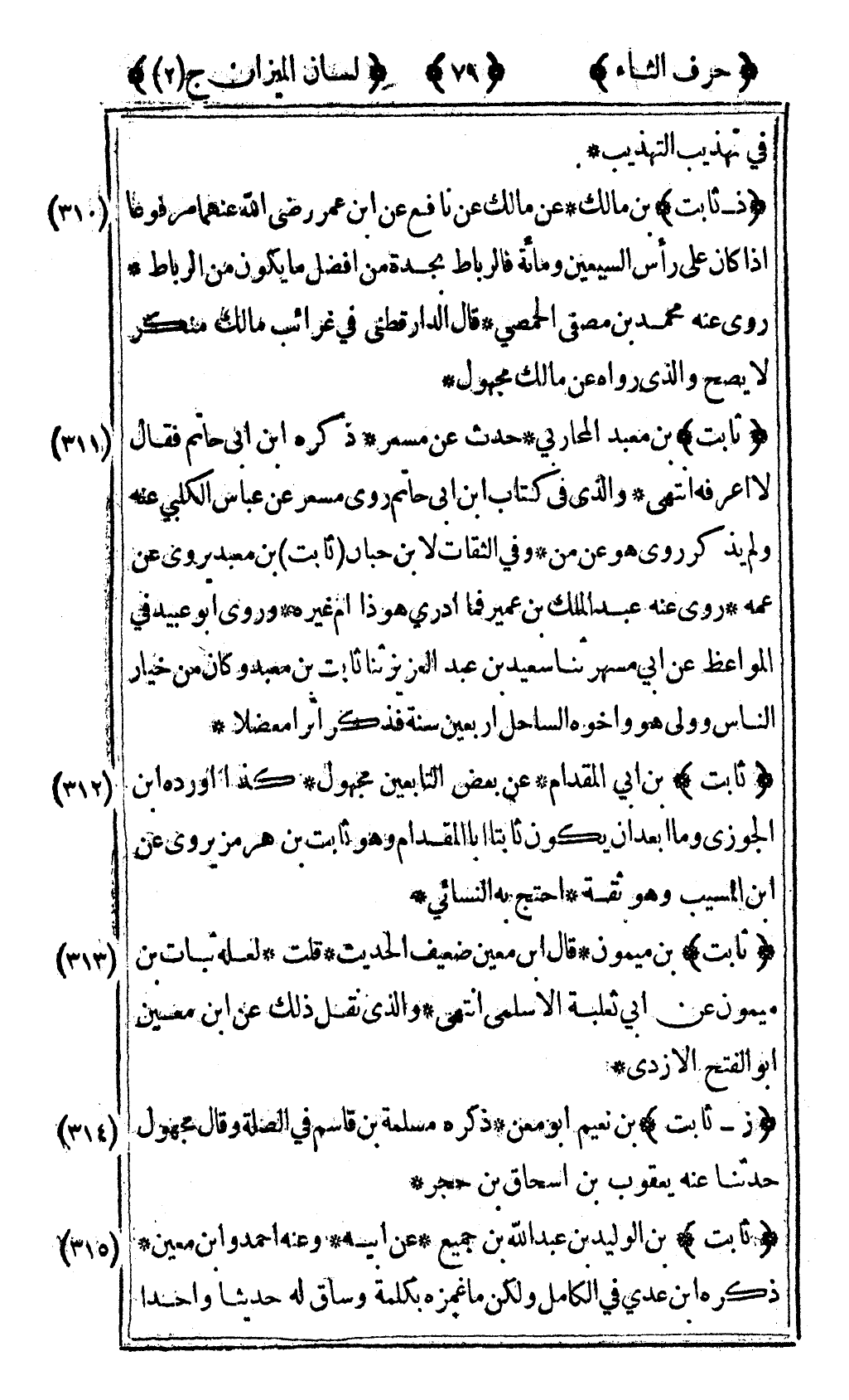 [312] "ثابت" بن أبي المقدام عن بعض التابعين مجهول كذا أورده ابن الجوزي وما ابعد أن يكون ثابتا أبا المقدام وهو ثابت بن هرمز يروي عن ابن المسيب وهو ثقة احتج به النسائي.