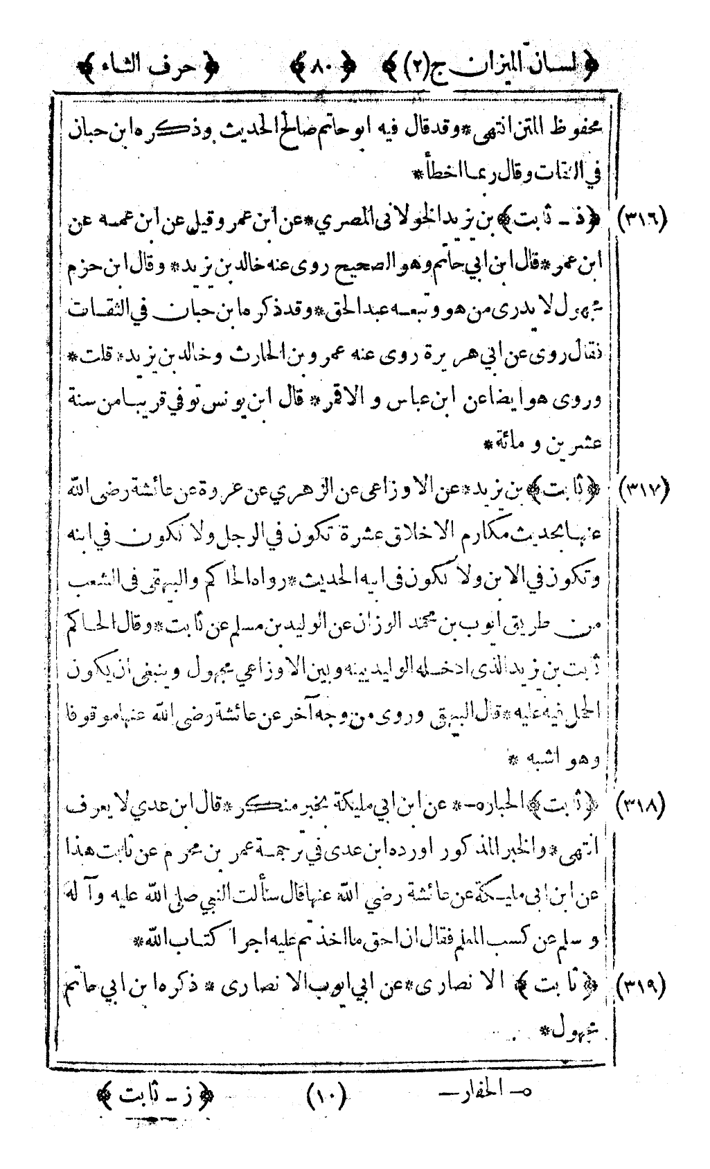[316] "ذ-ثابت" بن يزيد الخولاني المصري عن ابن عمر وقيل عن ابن عمه عن ابن عمر قال ابن أبي حاتم وهو الصحيح روى عنه خالد بن يزيد وقال ابن حزم مجهول لا يدري من هو وتبعه عبد الحق وقد ذكره ابن حبان في الثقات فقال روى عن أبي هريرة روى عنه عمرو بن الحارث وخالد بن يزيد قلت وروى هو أيضا عن ابن عباس والأقمر قال ابن يونس توفي قريبا من سنة عشرين ومائة.