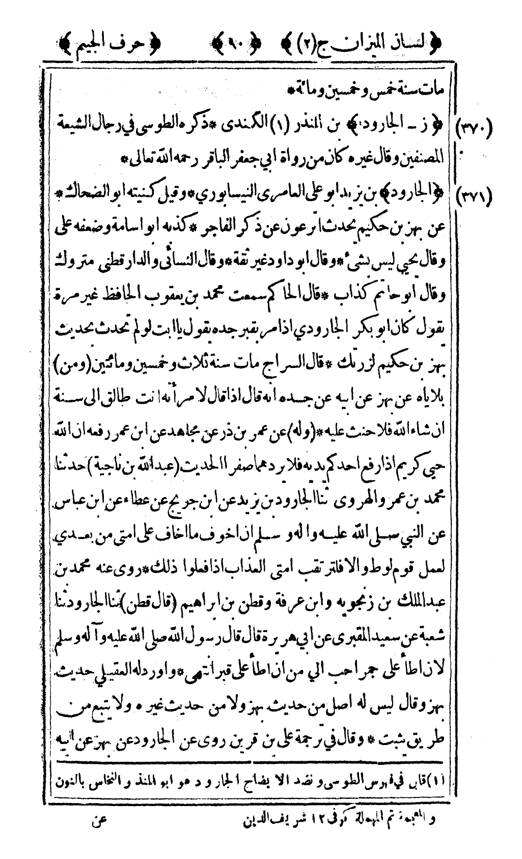 1 قال في فهرس الطوسي ونضد الإيضاح الجارود هو ابن المنذر النحاس بالنون والمعجمة ثم المهملة كوفي 12 شريف الدين.