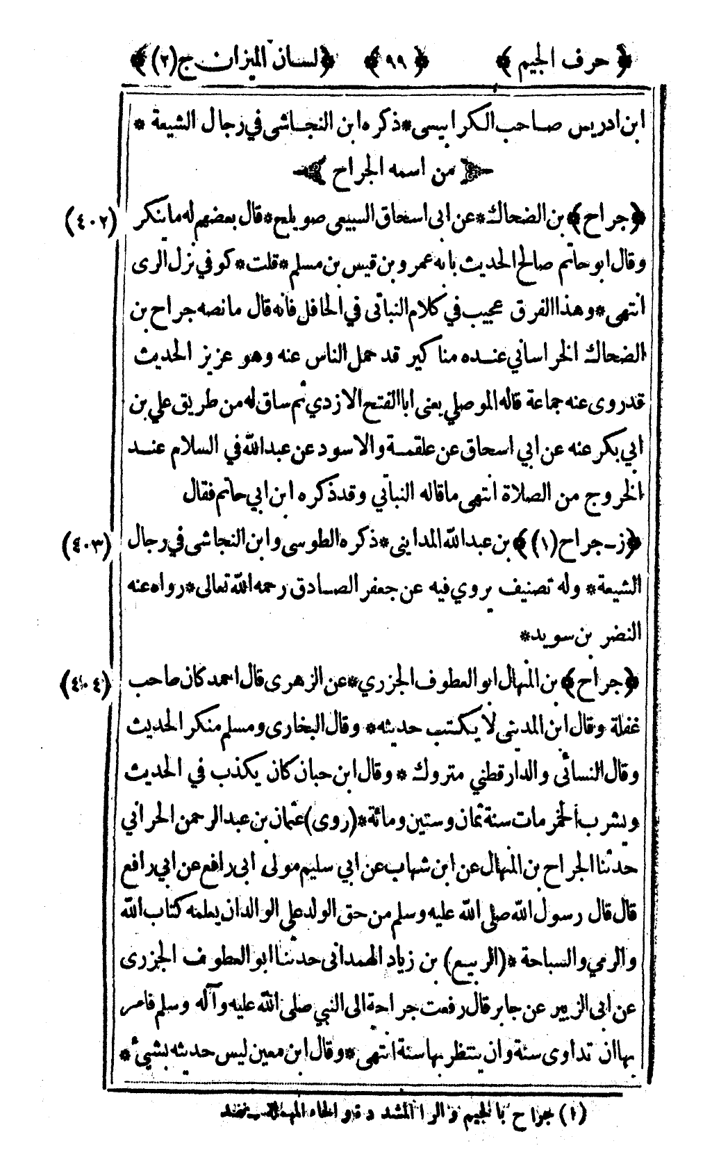 [403] "ز- جراح" 1 بن عبد الله المدايني ذكره الطوسي وابن النجاشي في رجال الشيعة وله تصنيف يروي فيه عن جعفر الصادق رحمه الله تعالى رواه عنه النضر بن سويد.