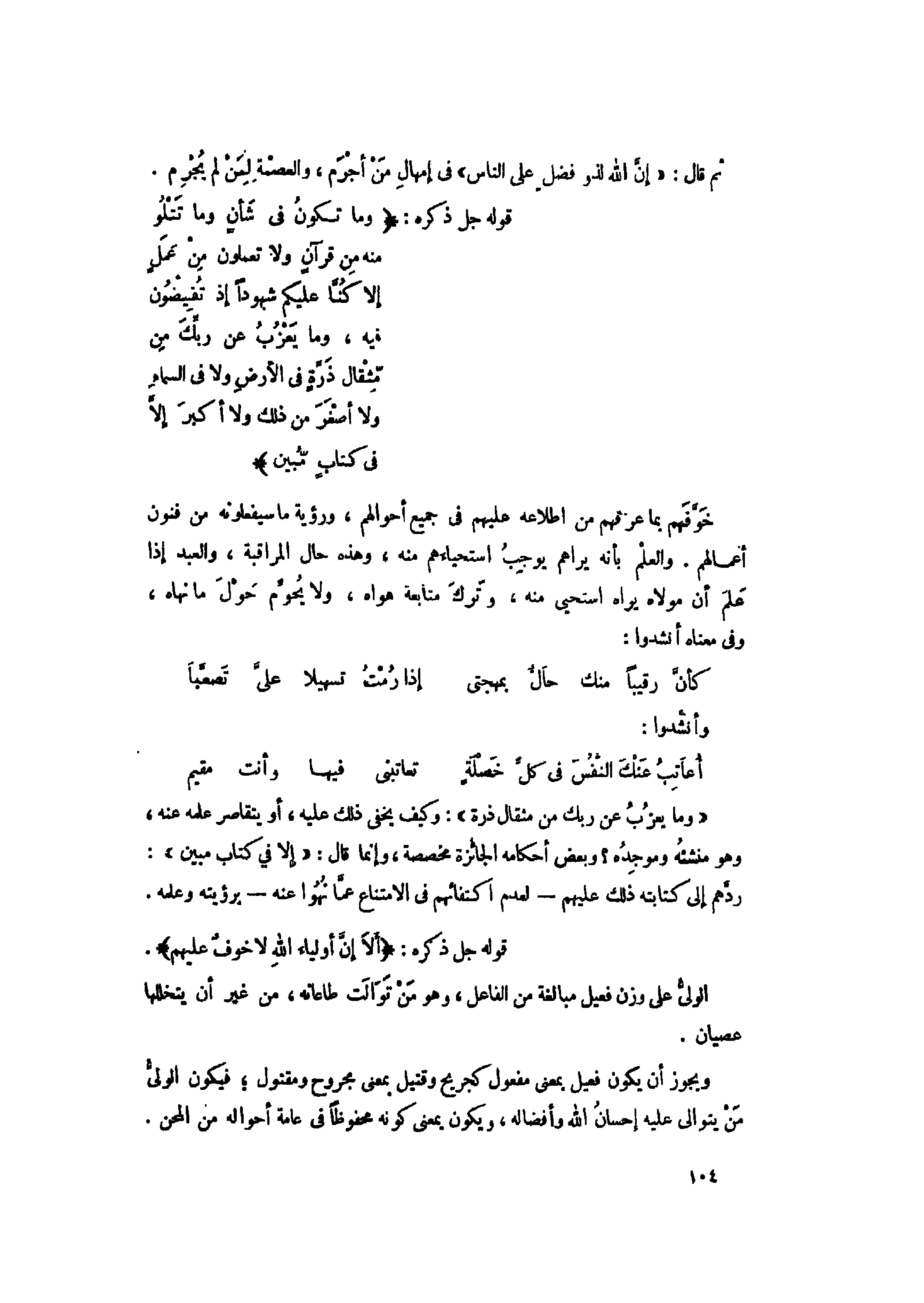 ويجوز أن يكون فعيل بمعنى مفعول كجريح وقتيل بمعنى مجروح ومقتول فيكون الولىّ من يتوالى عليه إحسان الله وأفضاله، ويكون بمعنى كونه محفوظا فى عامة أحواله من المحن.