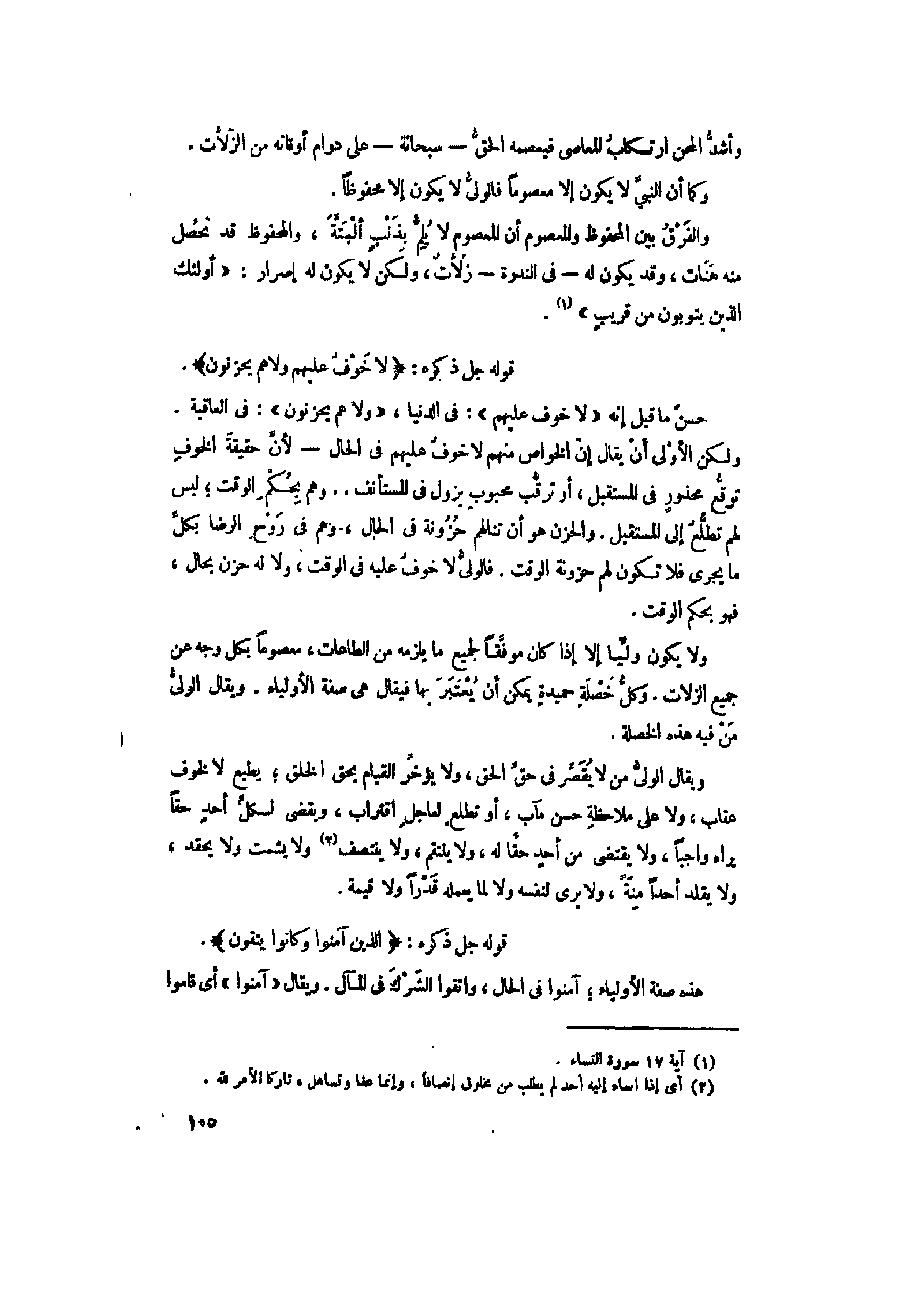 ولكن الأولى أن يقال إنّ الخواص منهم لا خوف عليهم فى الحال- لأنّ حقيقة الخوف توقّع محذور فى المستقبل، أو ترقّب محبوب يزول فى المستأنف.. وهم بحكم الوقت ليس لهم تطلّع إلى المستقبل. والحزن هو أن تنالهم حزونة فى الحال، وهم فى روح الرضا بكلّ ما يجرى فلا تكون لهم حزونة الوقت. فالولىّ لا خوف عليه فى الوقت، ولا له حزن بحال، فهو بحكم الوقت.