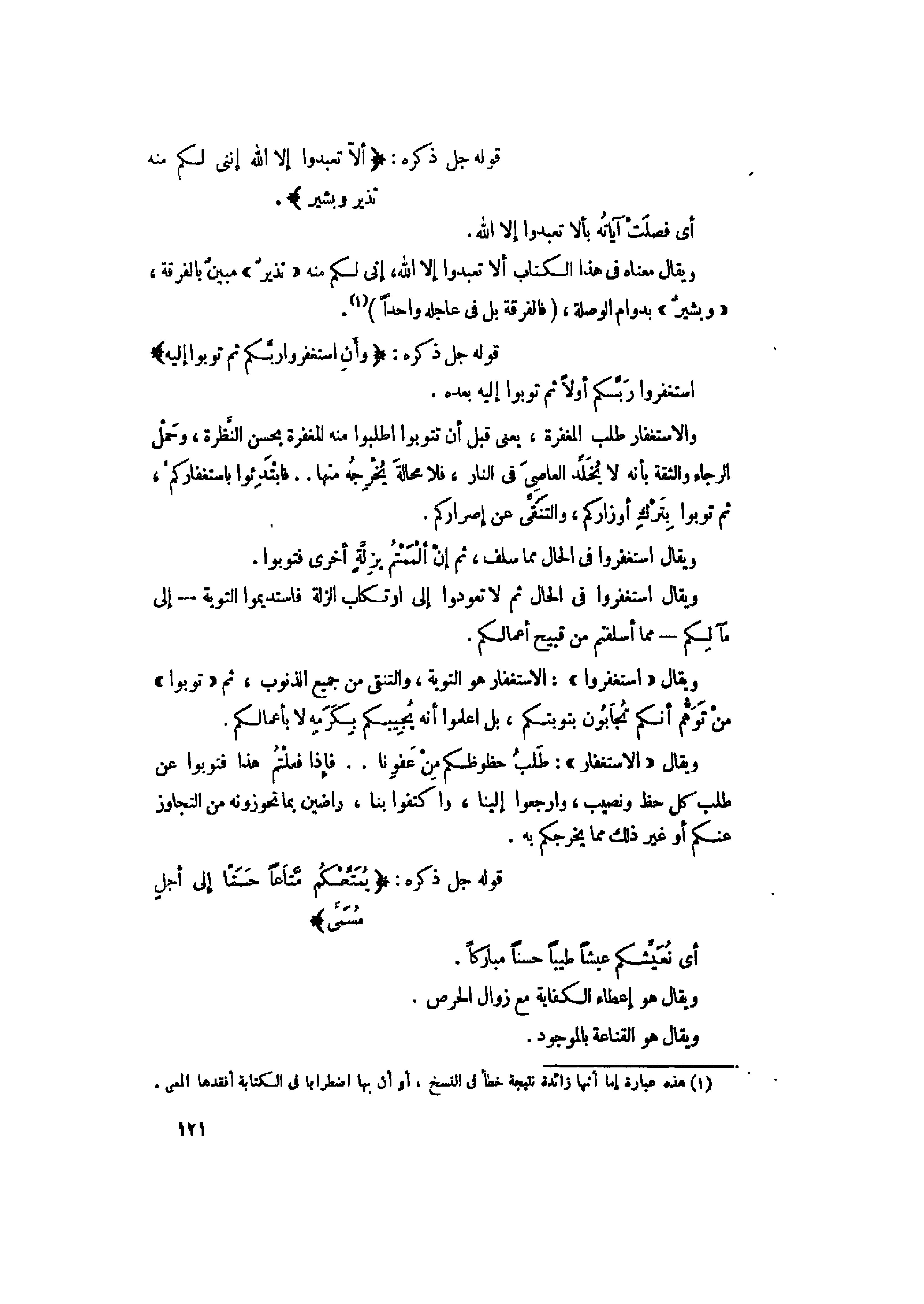 ويقال «اسْتَغْفِرُوا» : الاستغفار هو التوبة، والتنقى من جميع الذنوب، ثم «تُوبُوا» من توهّم أنكم تجابون بتوبتكم، بل اعلموا أنه يجيبكم بكرمه لا بأعمالكم.