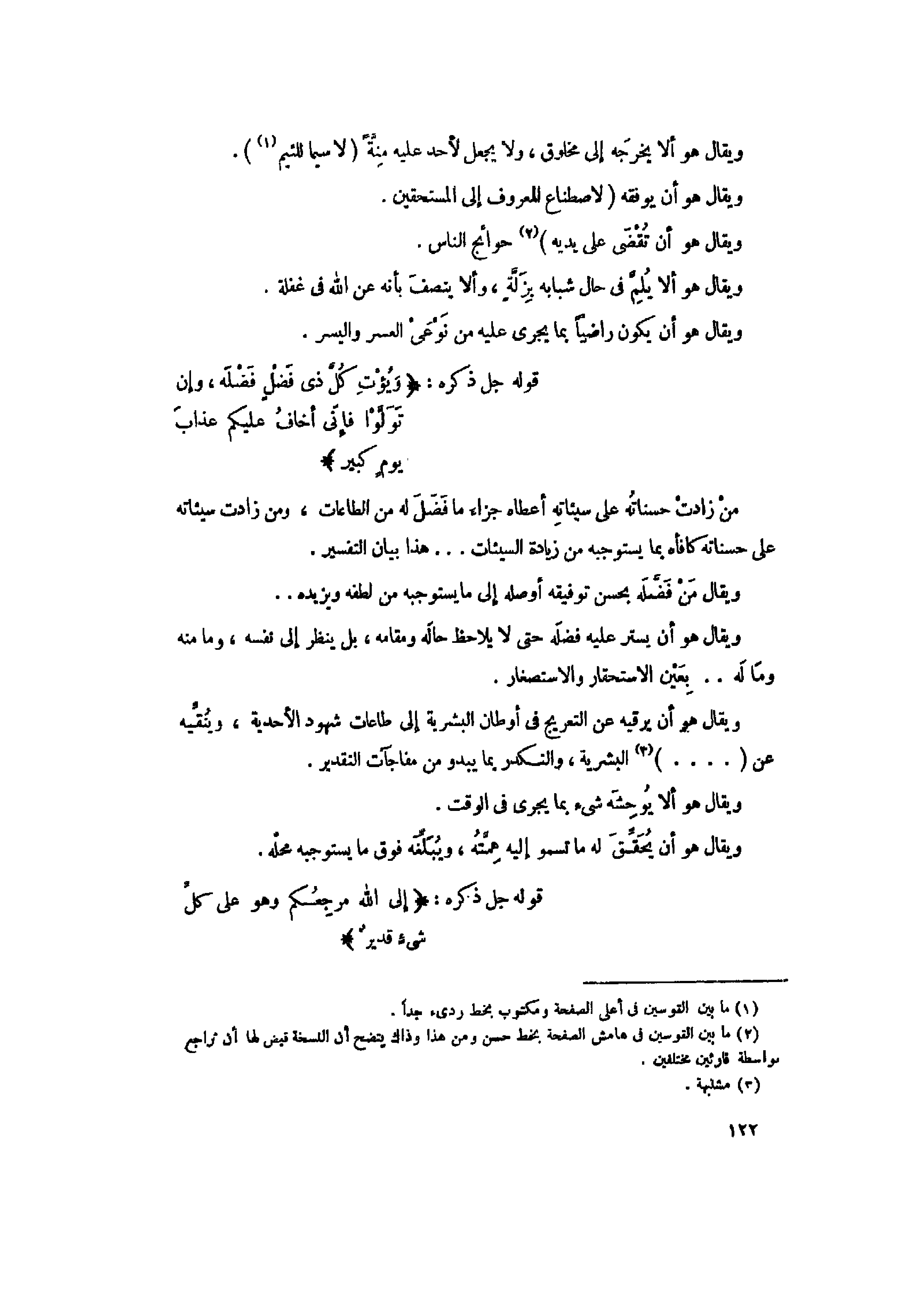 قوله جل ذكره: وَيُؤْتِ كُلَّ ذِي فَضْلٍ فَضْلَهُ، وَإِنْ تَوَلَّوْا فَإِنِّي أَخافُ عَلَيْكُمْ عَذابَ يَوْمٍ كَبِيرٍ من زادت حسناته على سيئاته أعطاه جزاء ما فضل له من الطاعات، ومن زادت سيئاته على حسناته كافأه بما يستوجبه من زيادة السيئات ... هذا بيان التفسير.