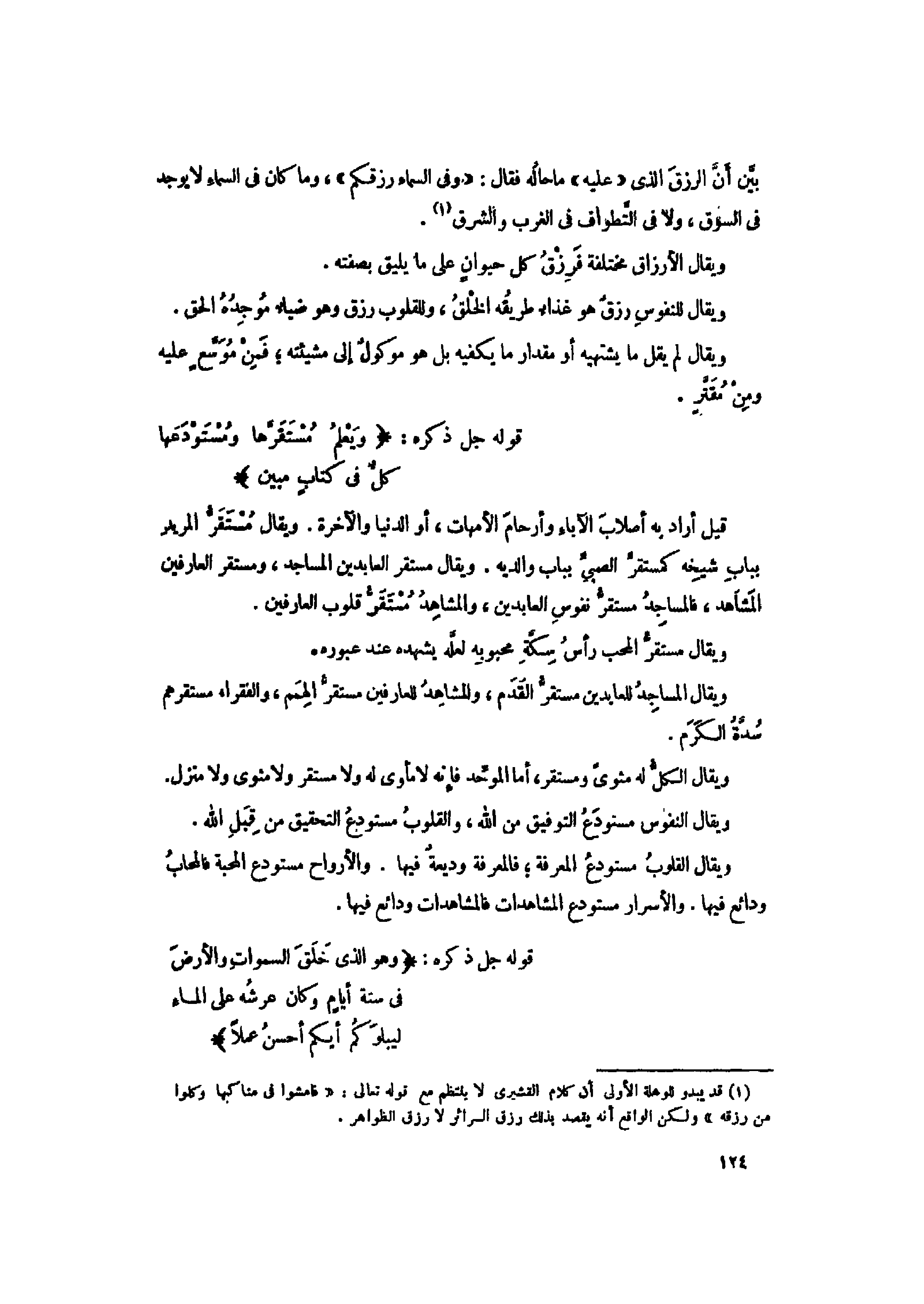 (1) قد يبدو للوهلة الأولى أن كلام القشيري لا ينتظم مع قوله تعالى: «فَامْشُوا فِي مَناكِبِها وَكُلُوا مِنْ رِزْقِهِ» ولكن الواقع أنه يقصد بذلك رزق السرائر لا رزق الظواهر. [.....]