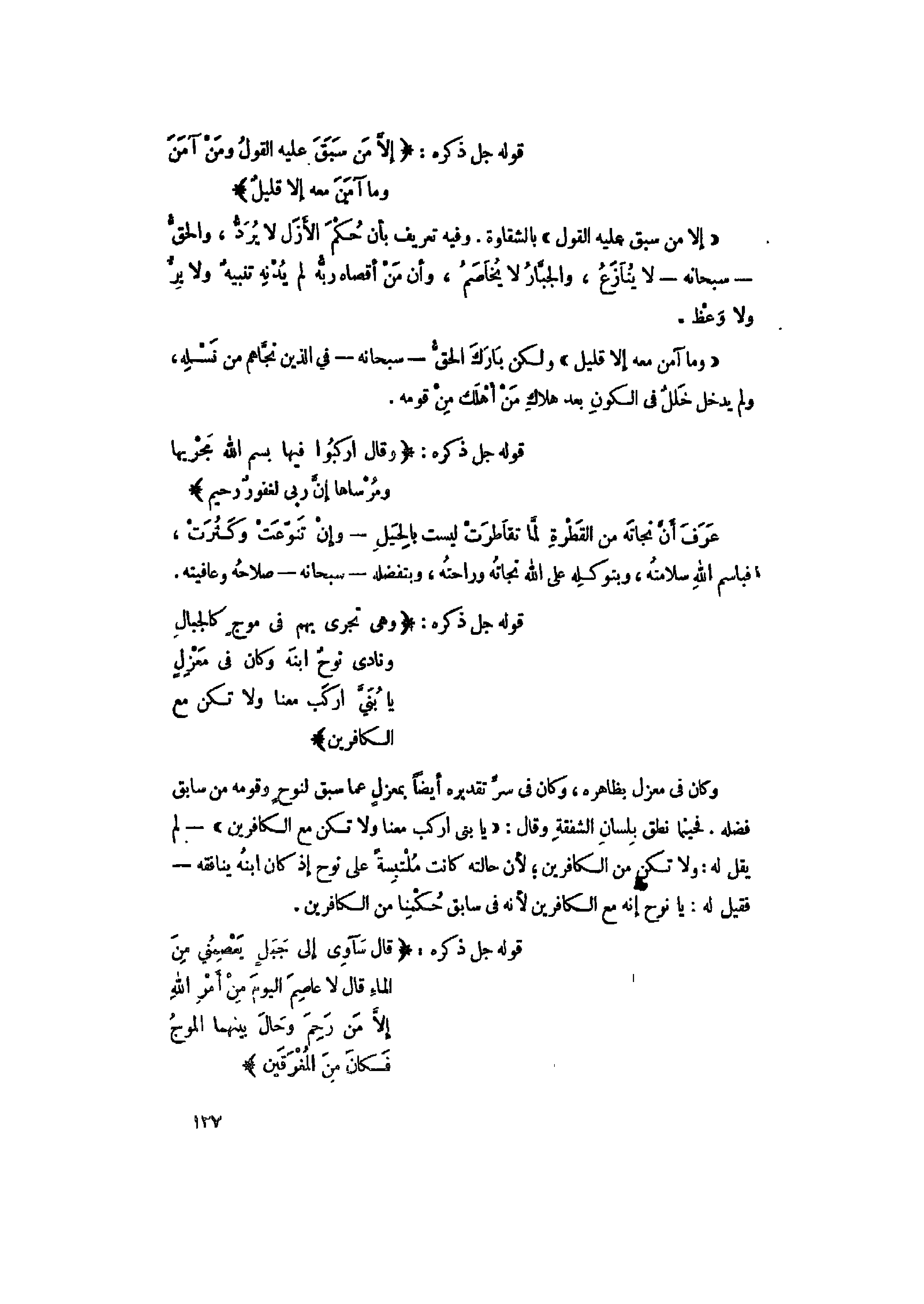 وكان فى معزل بظاهره، وكان فى سرّ تقديره أيضا بمعزل عما سبق لنوح وقومه من سابق فضله. فحينما نطق بلسان الشفقة وقال: «يا بُنَيَّ ارْكَبْ مَعَنا وَلا تَكُنْ مَعَ الْكافِرِينَ» - لم يقل له: ولا تكن من الكافرين لأن حالته كانت ملتبسة على نوح إذ كان ابنه ينافقه- فقيل له: يا نوح إنه مع الكافرين لأنه فى سابق حكمنا من الكافرين.