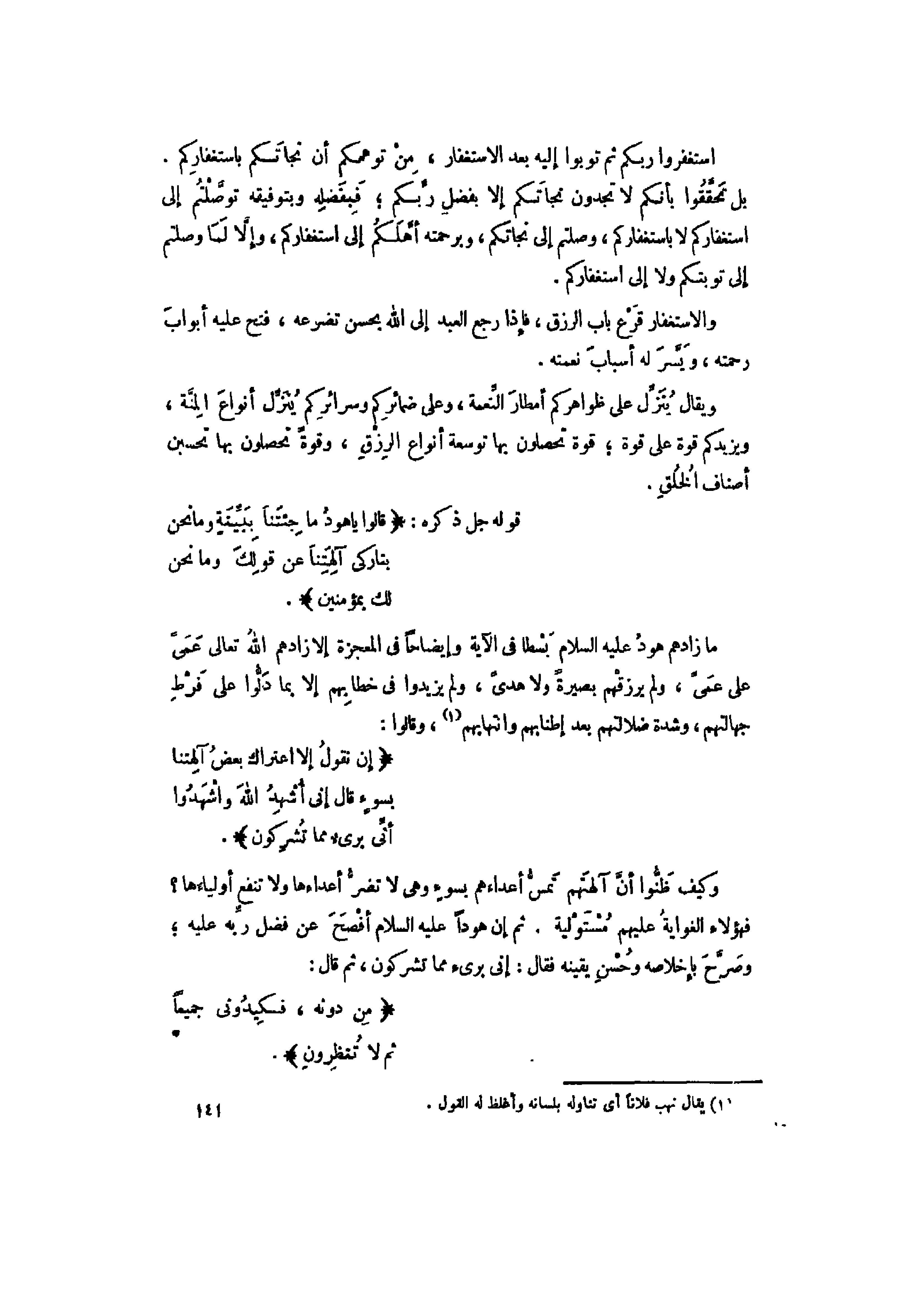 ما زادهم هود عليه السلام بسطا فى الآية وإيضاحا فى المعجزة إلا زادهم الله تعالى عمى على عمى، ولم يرزقهم بصيرة ولا هدى، ولم يزيدوا فى خطابهم إلا بما دلّوا على فرط جهالتهم، وشدة ضلالتهم بعد إطنابهم وانتهابهم «1» ، وقالوا: