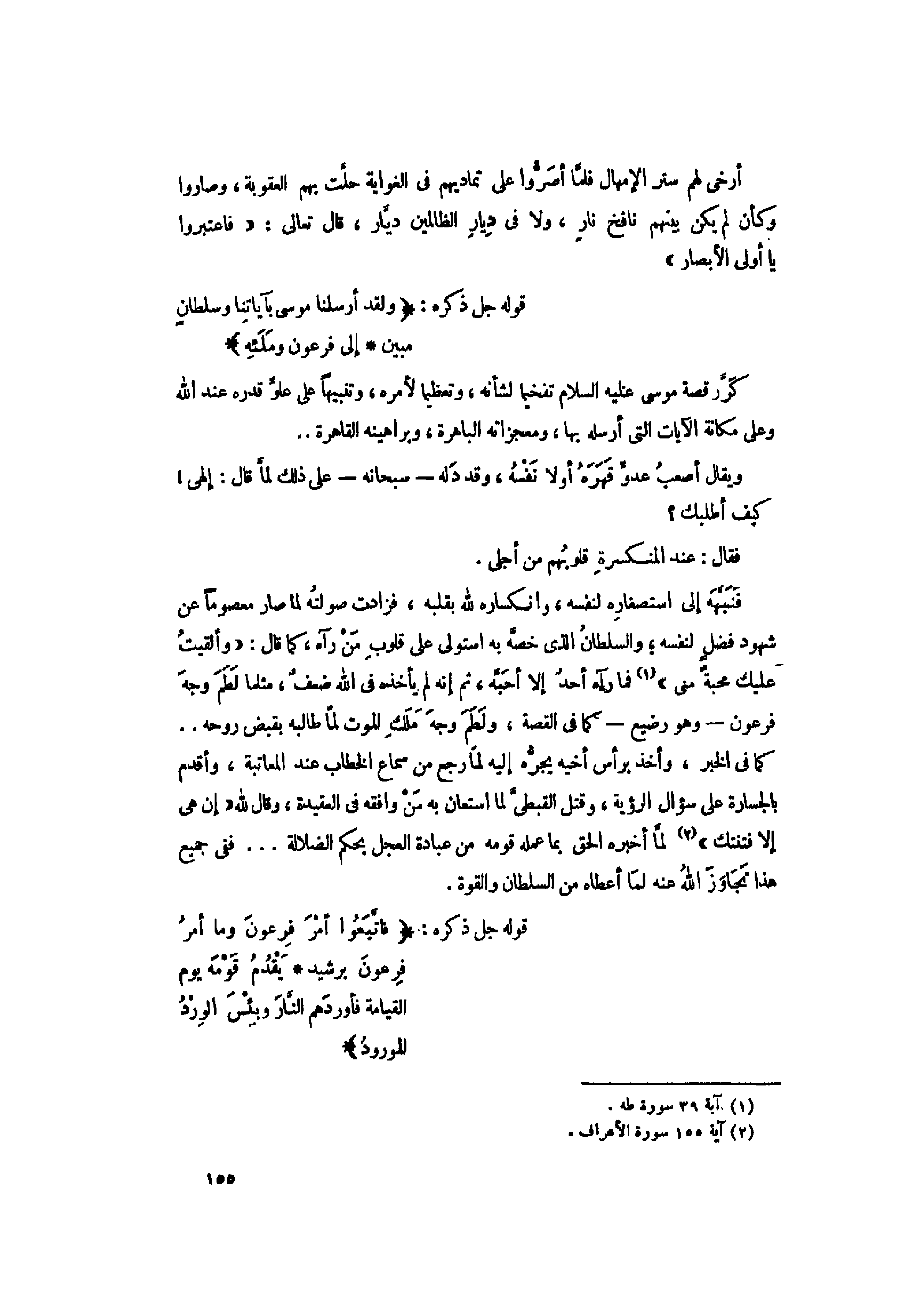 كما فى الخبر، وأخذ برأس أخيه يجرّه إليه لمّا رجع من سماع الخطاب عند المعاتبة، وأقدم بالجسارة على سؤال الرؤية، وقتل القبطىّ لما استعان به من وافقه فى العقيدة، وقال لله «إِنْ هِيَ إِلَّا فِتْنَتُكَ» «2» لمّا أخبره الحق بما عمله قومه من عبادة العجل بحكم الضلالة ... ففى جميع هذا تجاوز الله عنه لما أعطاه من السلطان والقوة.