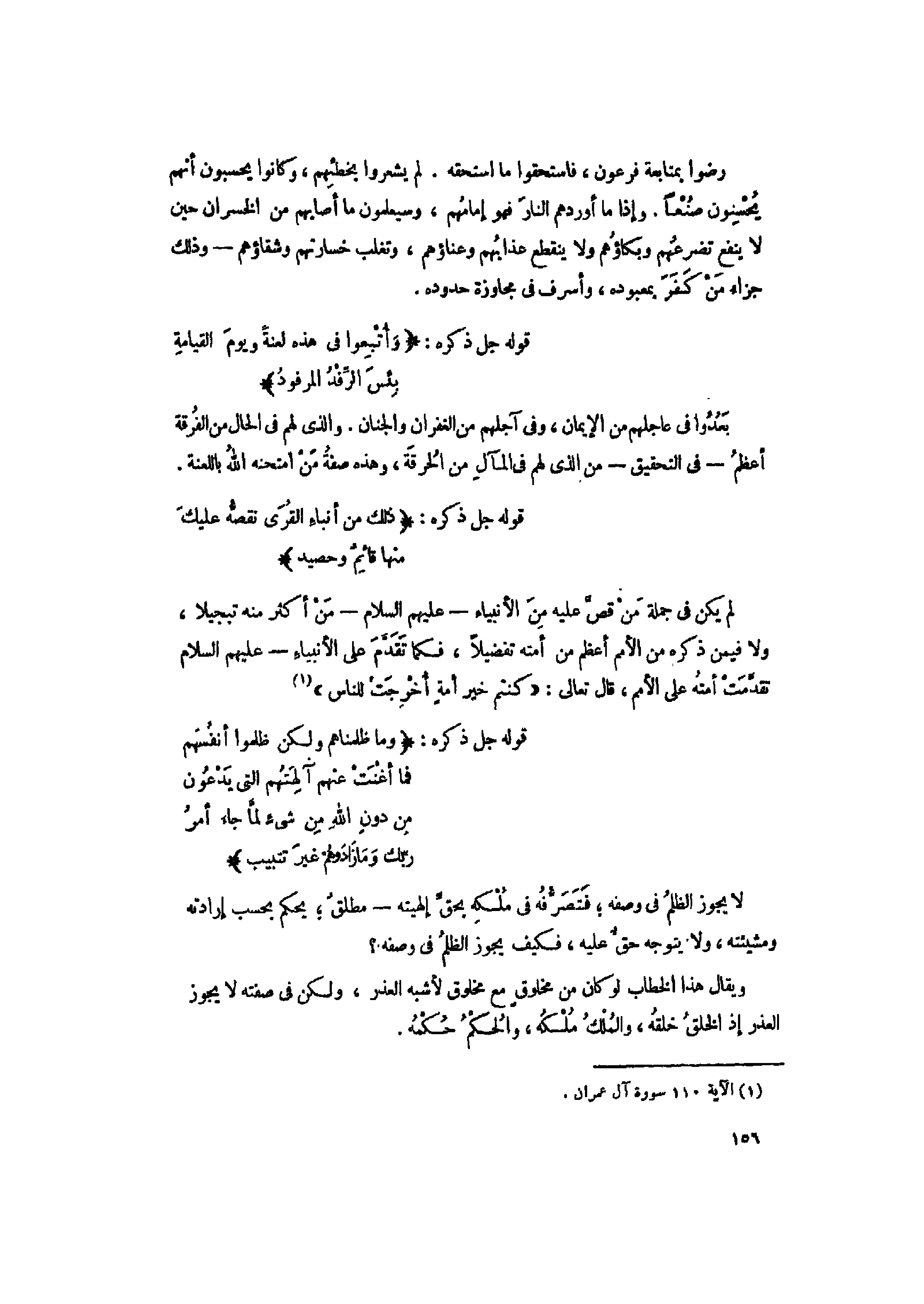 ويقال هذا الخطاب لو كان من مخلوق مع مخلوق لأشبه العذر، ولكن فى صفته لا يجوز العذر إذ الخلق خلقه، والملك ملكه، والحكم حكمه.