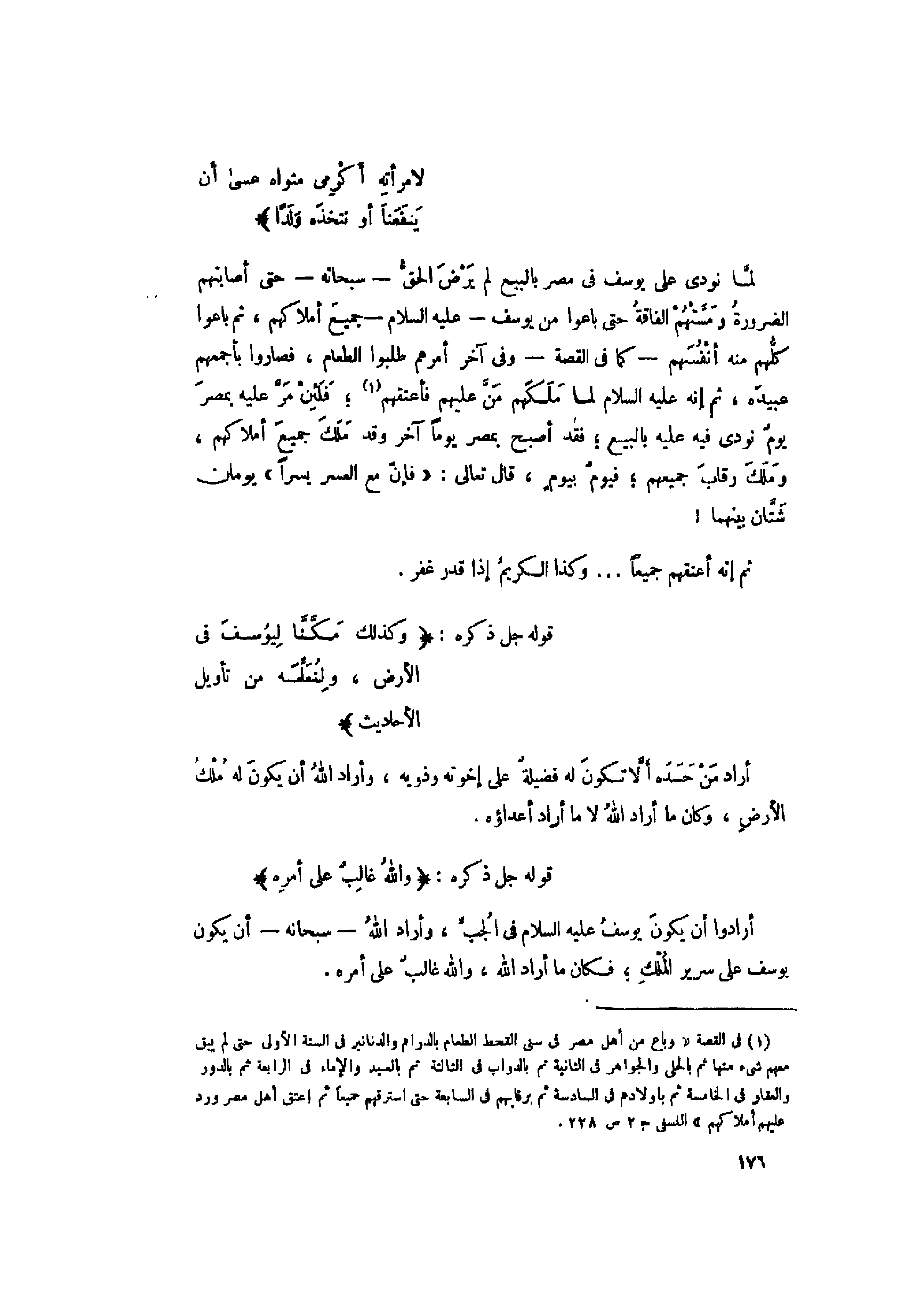 (1) فى القصة «وباع من أهل مصر فى سنى القحط الطعام بالدراهم والدنانير فى السنة الأولى حتى لم يبق معهم شىء منها ثم بالحلى والجواهر فى الثانية تم بالدواب فى الثالثة تم بالعبيد والإماء فى الرابعة ثم بالدور والعقار فى الخامسة ثم باولادهم فى السادسة ثم برقابهم فى السابعة حتى استرقهم جميعا ثم أعتق أهل مصر ورد عليهم أملاكهم» النسفي ج 2 ص 228.