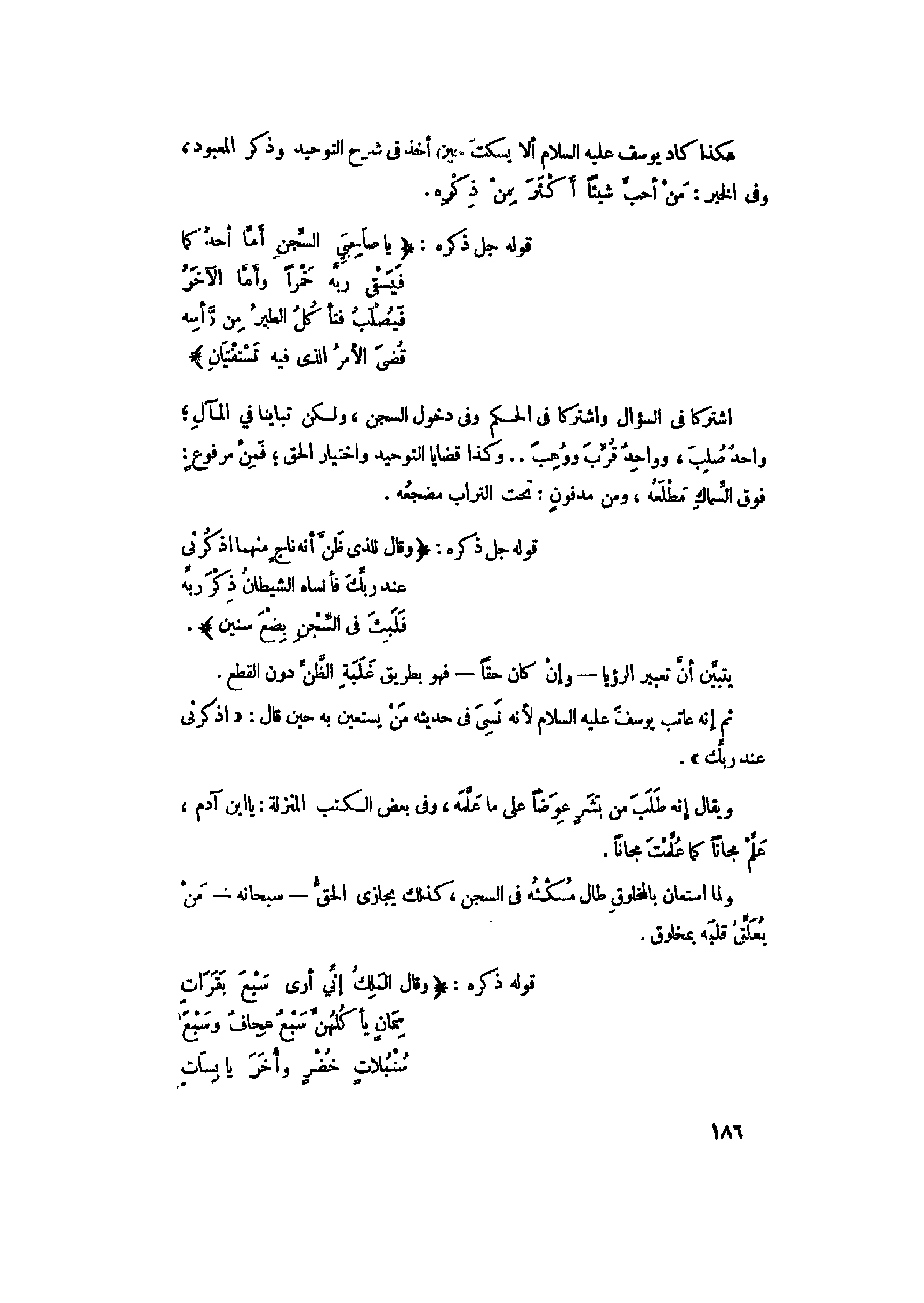 هكذا كاد يوسف عليه السلام ألا يسكت حين أخذ فى شرح التوحيد وذكر المعبود، وفى الخبر: من أحبّ شيئا أكثر من ذكره.