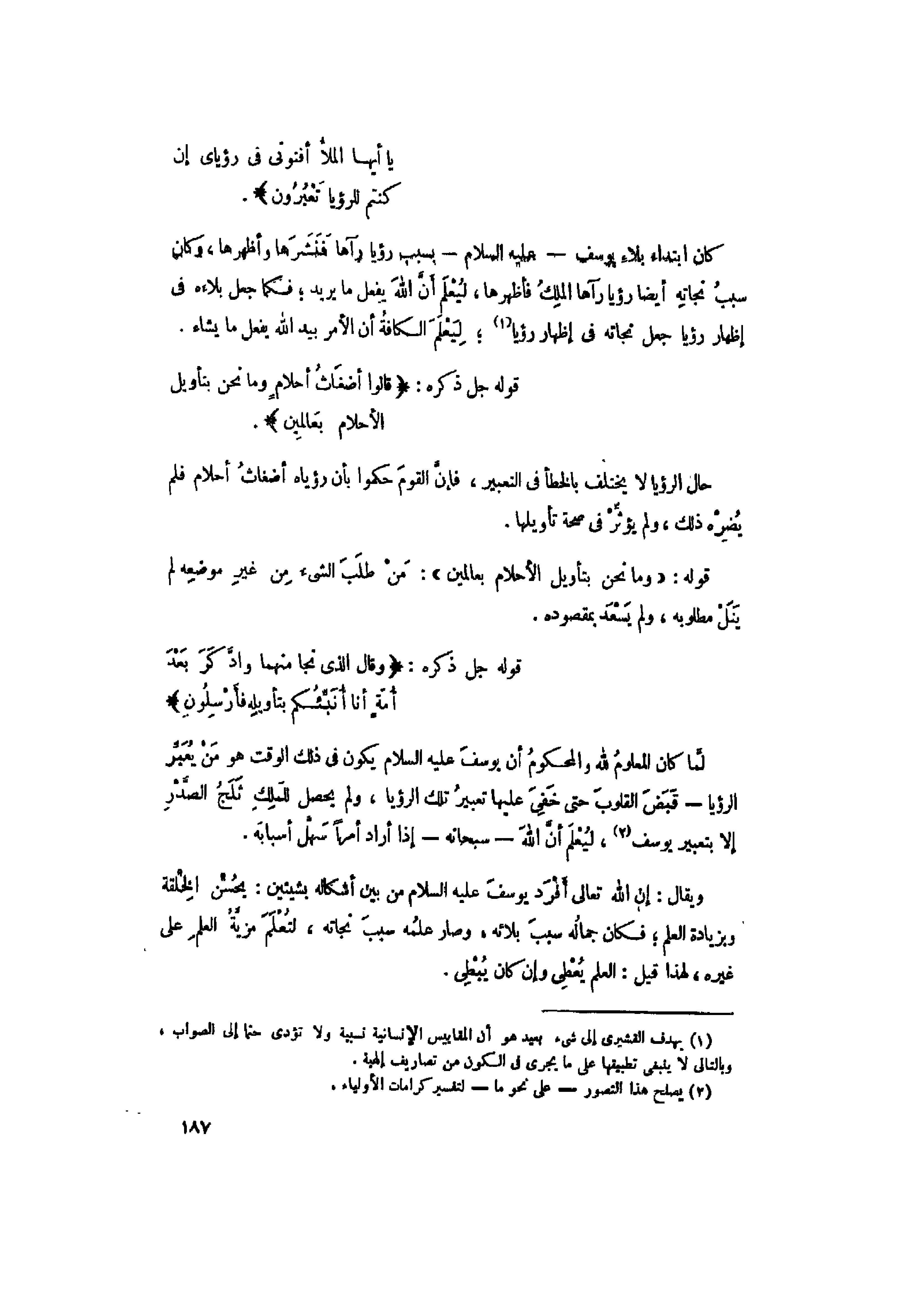 (1) بهدف القشيري إلى شىء بعيد هو أن المقاييس الإنسانية نسبية ولا تؤدى حتما إلى الصواب، وبالتالى لا ينبغى تطبيقها على ما يجرى فى الكون من تصاريف إلهية.