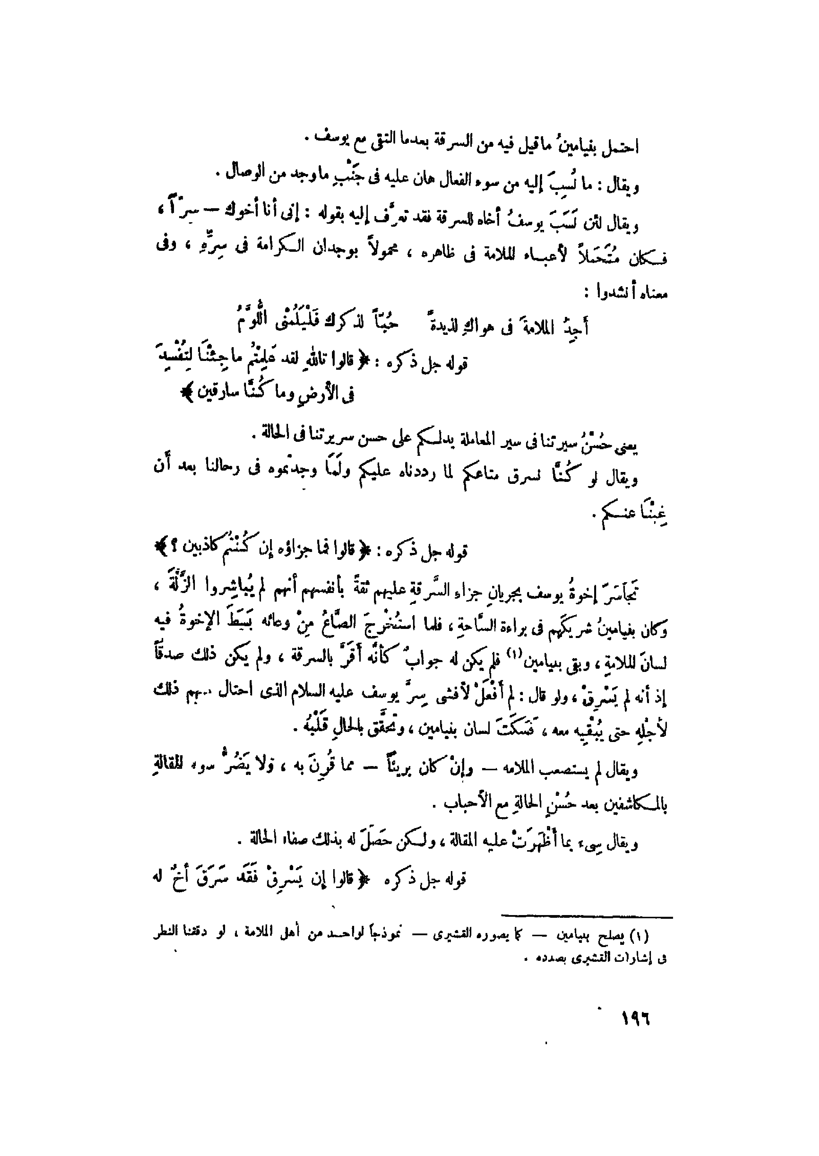 ويقال لئن نسب يوسف أخاه للسرقة فقد تعرّف إليه بقوله: إنى أنا أخوك- سرّا، فكان متحملا لأعباء الملامة فى ظاهره، محمولا بوجدان الكرامة فى سره، وفى معناه أنشدوا: