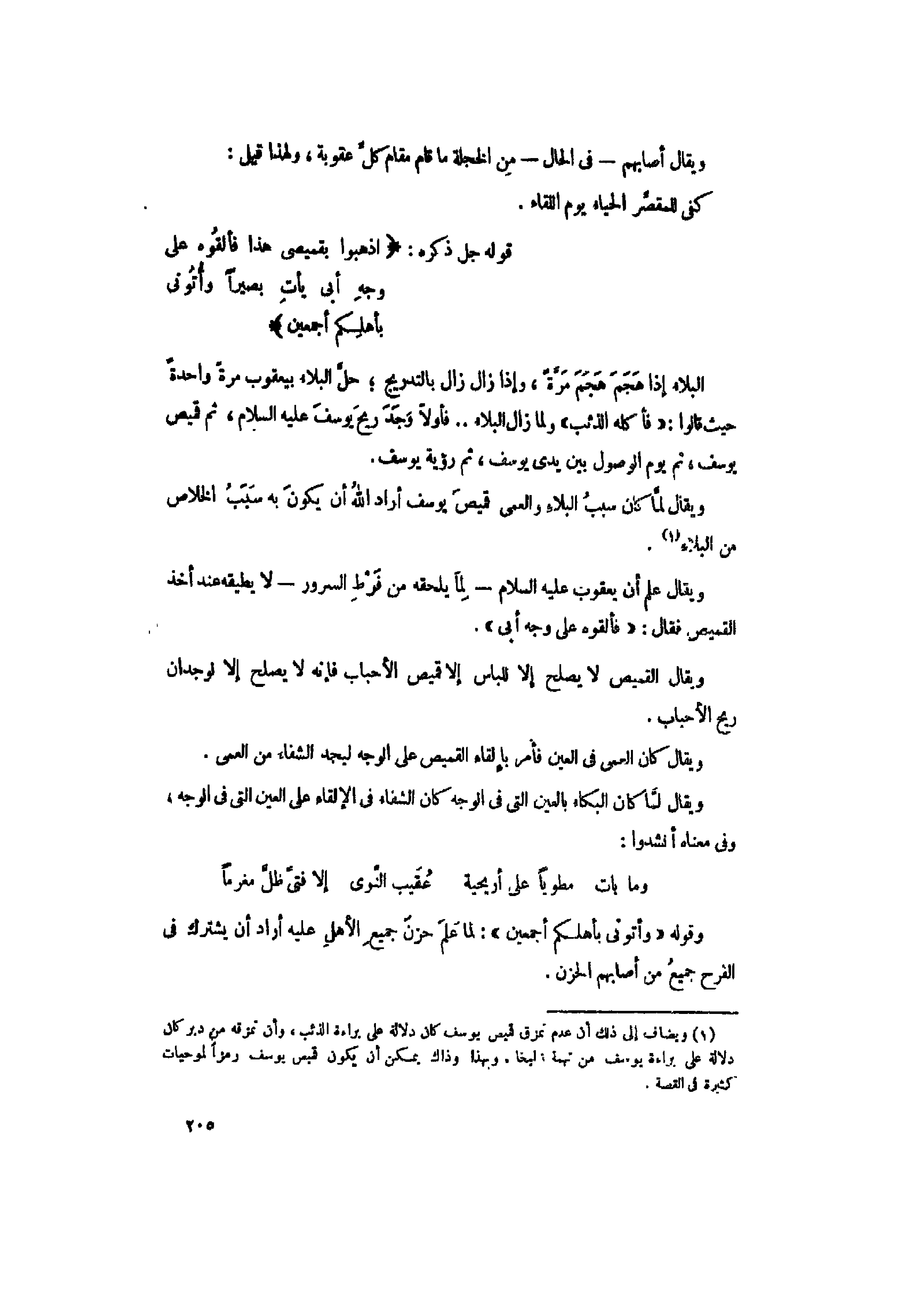 وقوله «وَأْتُونِي بِأَهْلِكُمْ أَجْمَعِينَ» : لما علم حزن جميع الأهل عليه أراد أن يشترك فى الفرح جميع من أصابهم الحزن.