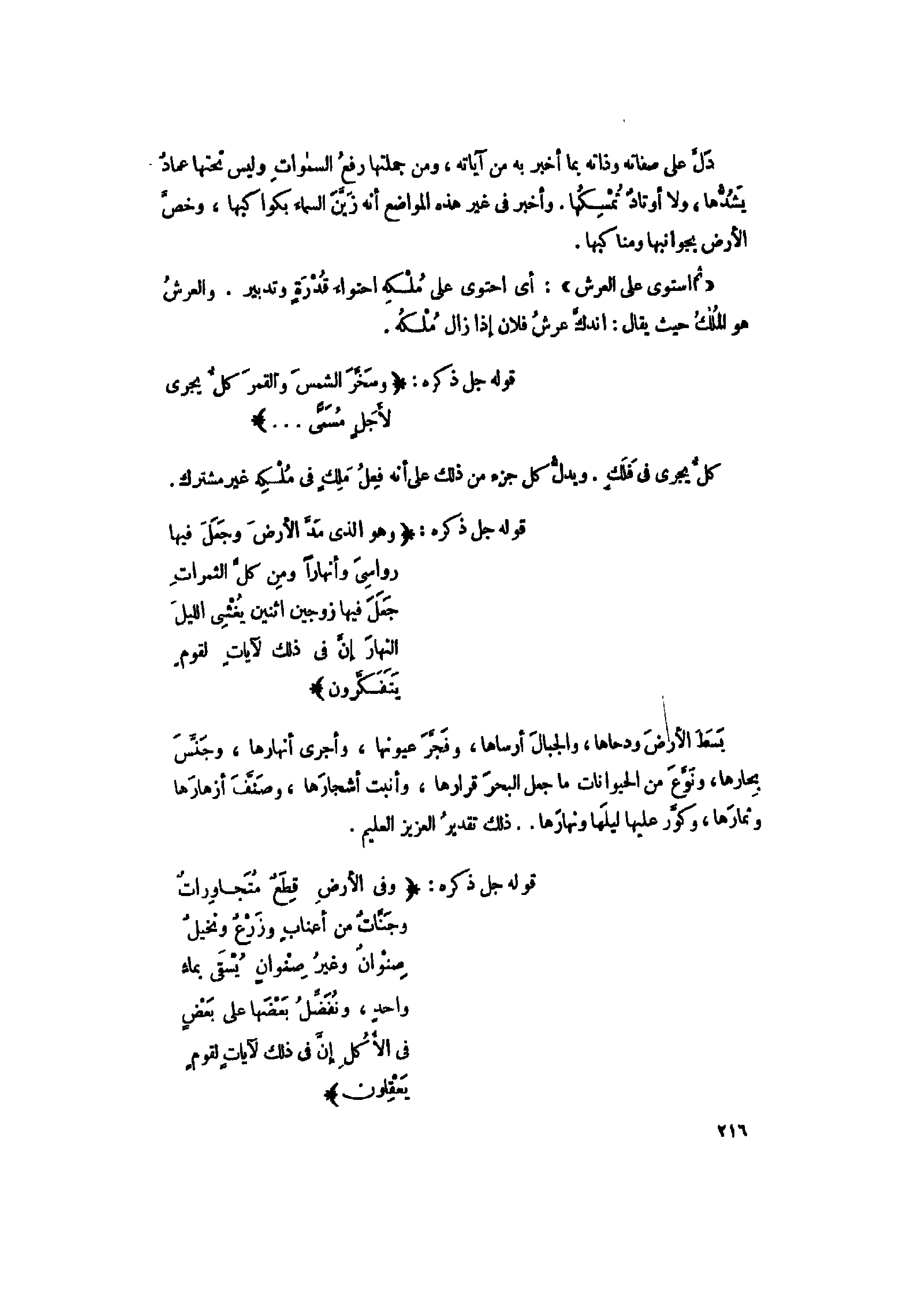 دلّ على صفاته وذاته بما أخبر به من آياته، ومن جملتها رفع السماوات وليس تحتها عماد يشدّها، ولا أوتاد تمسكها. وأخبر فى غير هذه المواضع أنه زيّن السماء بكواكبها، وخصّ الأرض بجوانبها ومناكبها.