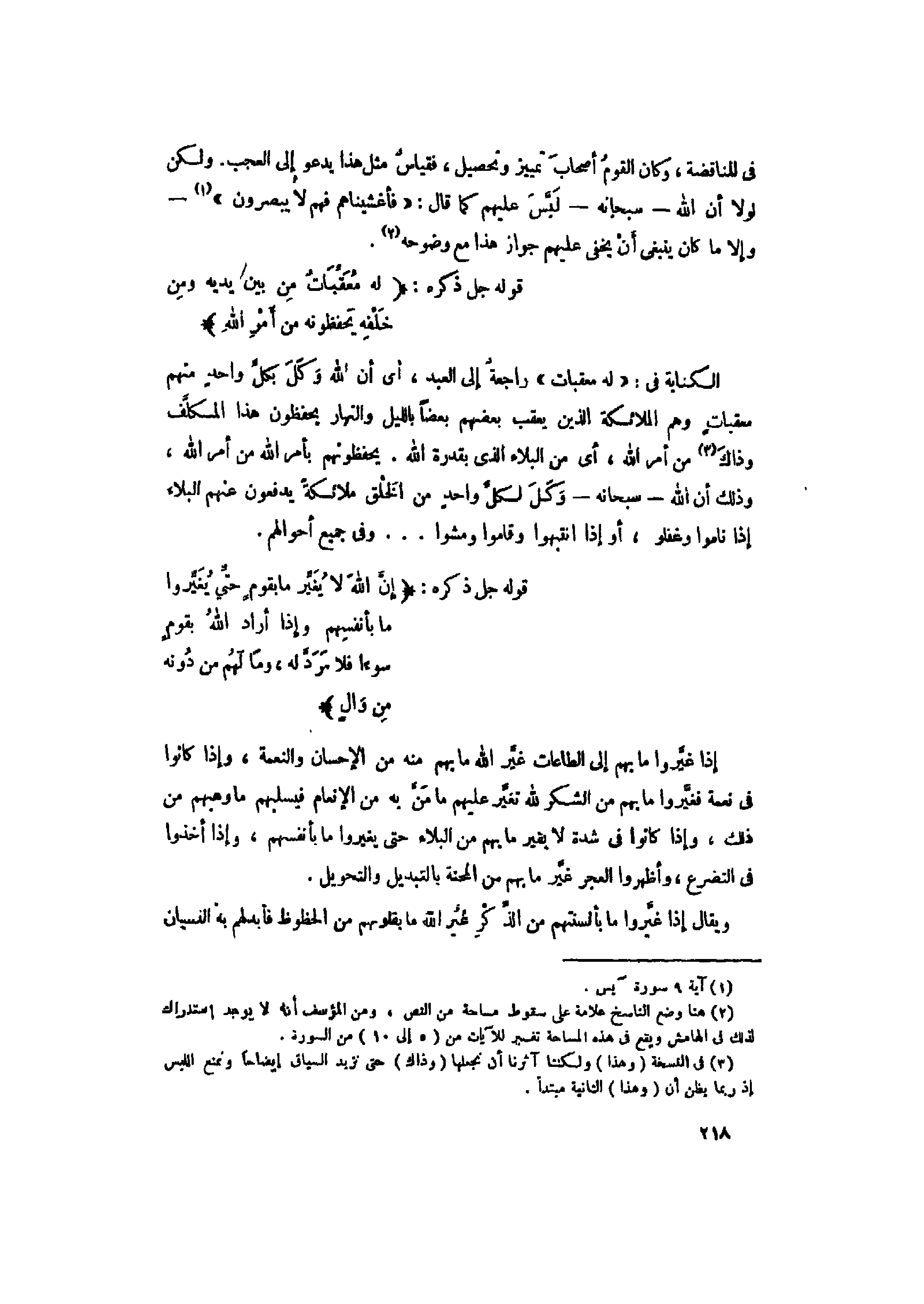 الكناية فى: «لَهُ مُعَقِّباتٌ» راجعة إلى العبد، أي أن الله وكل بكلّ واحد منهم معقبات وهم الملائكة الذين يعقب بعضهم بعضا بالليل والنهار يحفظون هذا المكلّف وذاك «3» من أمر الله، أي من البلاء الذي بقدرة الله. يحفظونهم بأمر الله من أمر الله، وذلك أن الله- سبحانه- وكل لكلّ واحد من الخلق ملائكة يدفعون عنهم البلاء إذا ناموا وغفلو، أو إذا انتبهوا وقاموا ومشوا ... وفى جميع أحوالهم.
