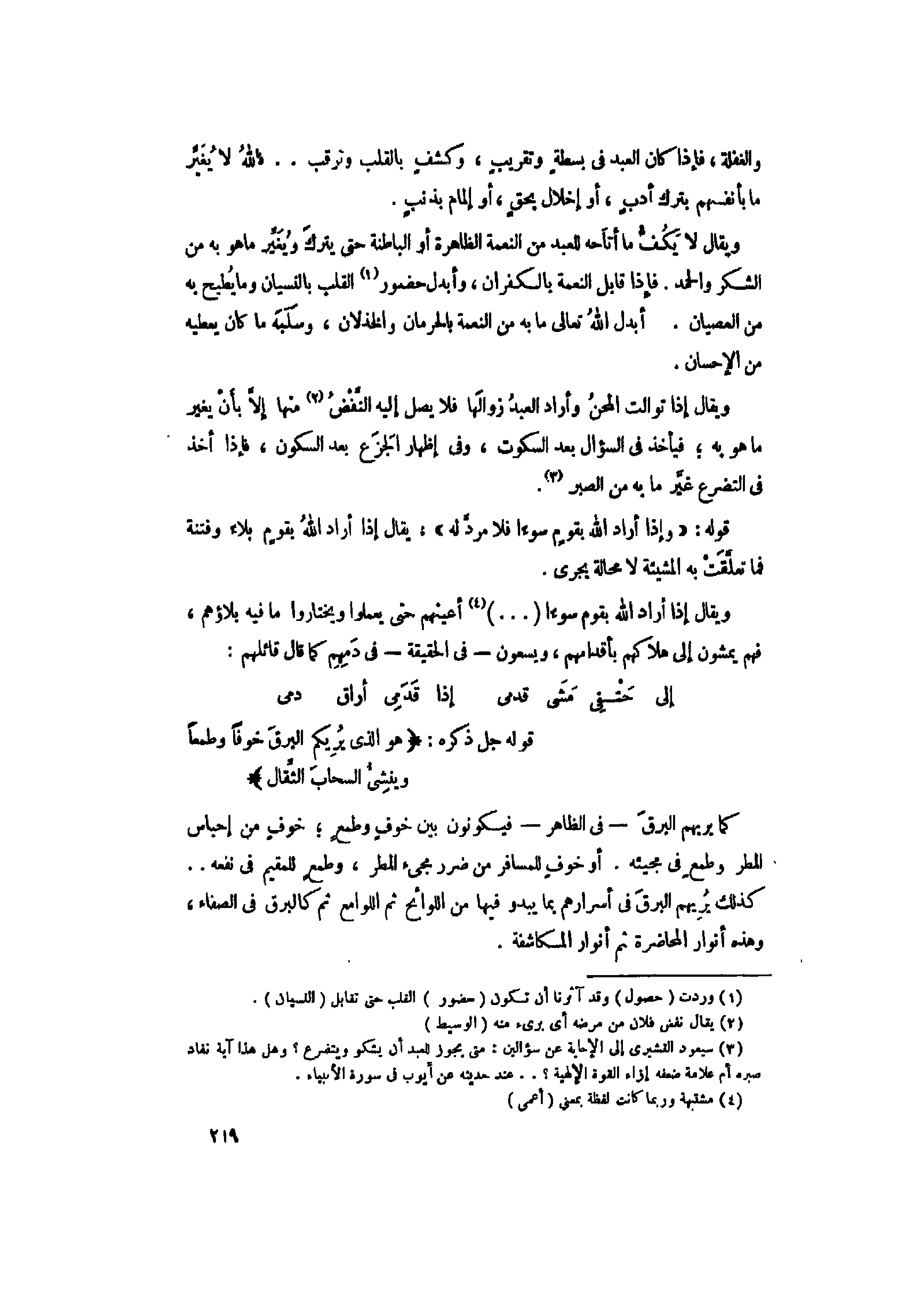 كذلك يريهم البرق فى أسرارهم بما يبدو فيها من اللوائح ثم اللوامع ثم كالبرق فى الصفاء، وهذه أنوار المحاضرة ثم أنوار المكاشفة.