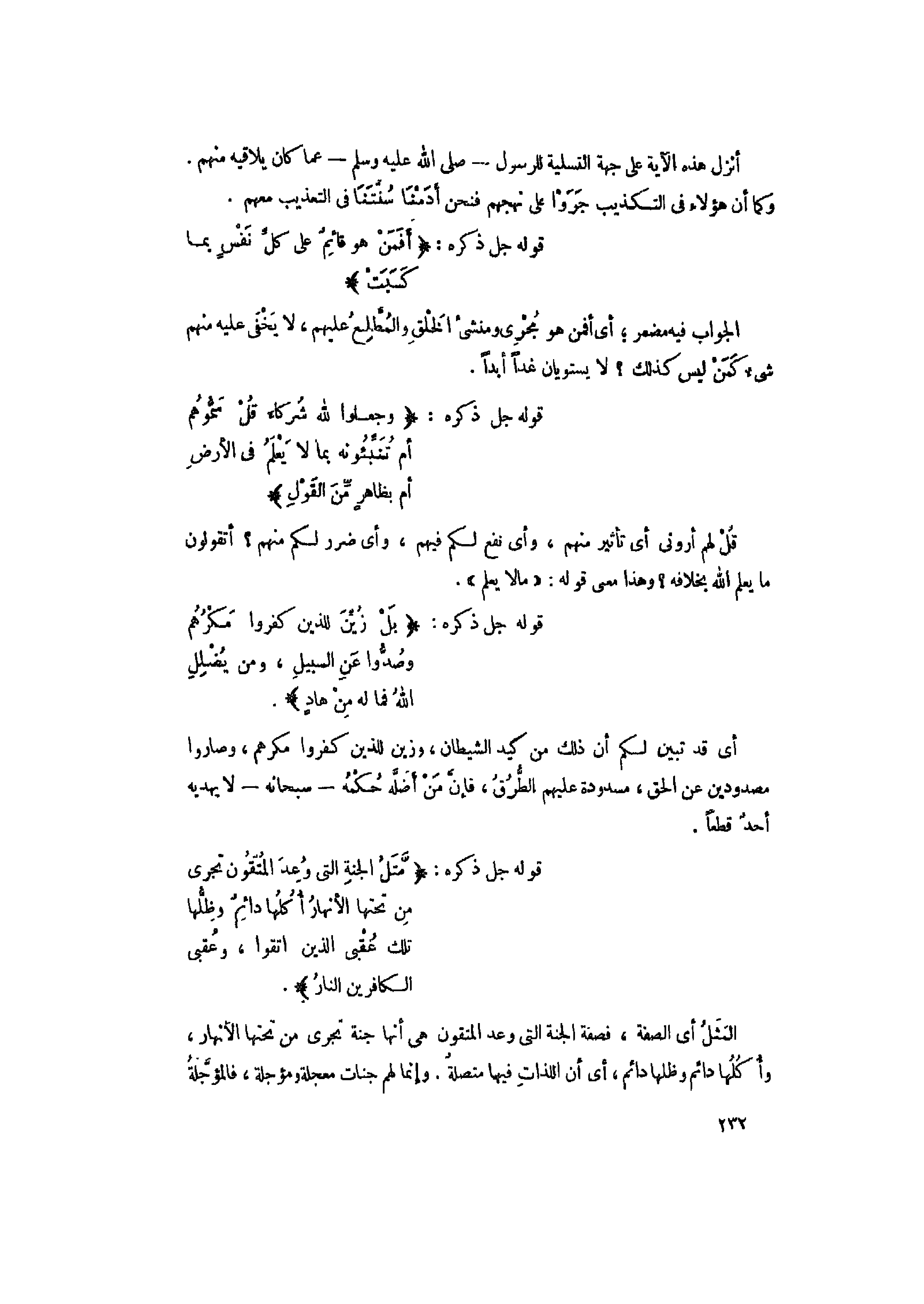 أَفَمَنْ هُوَ قائِمٌ عَلى كُلِّ نَفْسٍ بِما كَسَبَتْ وَجَعَلُوا لِلَّهِ شُرَكاءَ قُلْ سَمُّوهُمْ أَمْ تُنَبِّئُونَهُ بِما لا يَعْلَمُ فِي الْأَرْضِ أَمْ بِظاهِرٍ مِنَ الْقَوْلِ بَلْ زُيِّنَ لِلَّذِينَ كَفَرُوا مَكْرُهُمْ وَصُدُّوا عَنِ السَّبِيلِ وَمَنْ يُضْلِلِ اللَّهُ فَما لَهُ مِنْ هادٍ (33)