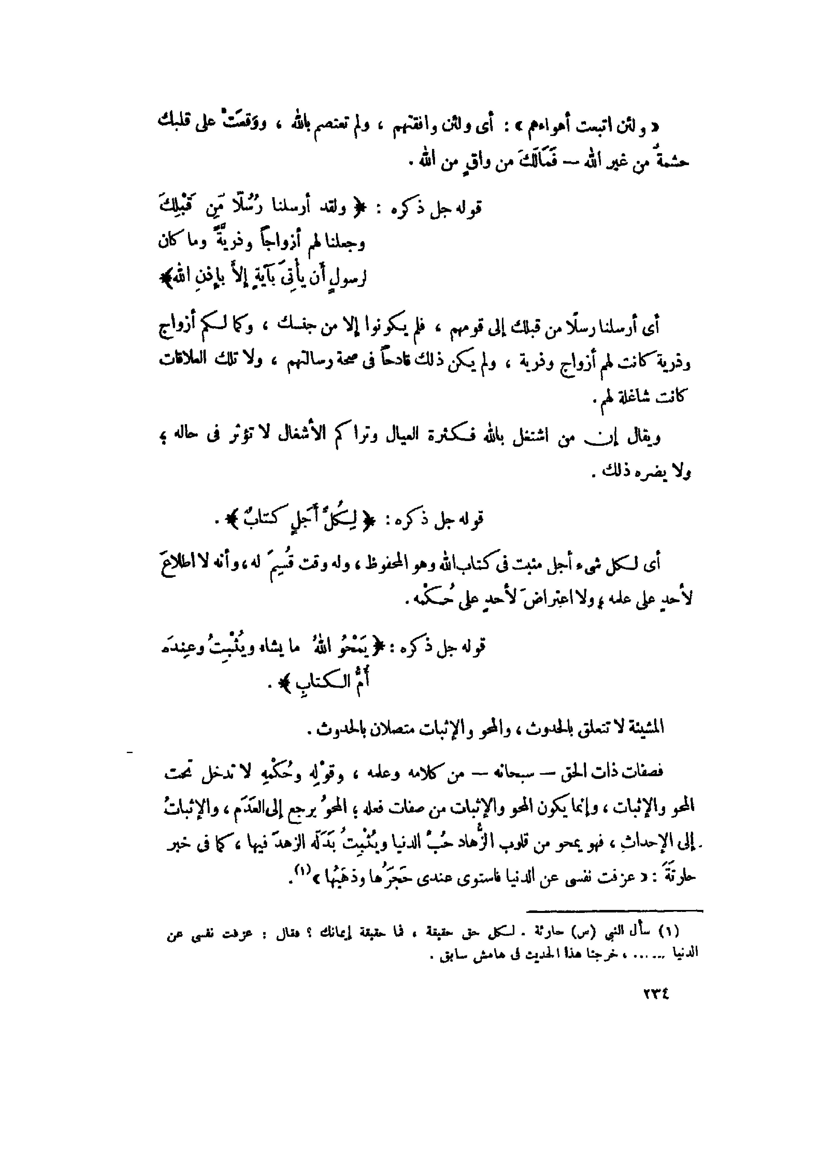فصفات ذات الحق- سبحانه- من كلامه وعلمه، وقوله وحكمه لا تدخل تحت المحو والإثبات، وإنما يكون المحو والإثبات من صفات فعله المحو يرجع إلى العدم، والإثبات إلى الإحداث، فهو يمحو من قلوب الزّهاد حب الدنيا ويثبت بدله الزهد فيها، كما فى خبر حارثة: «عزفت نفسى عن الدنيا فاستوى عندى حجرها وذهبها» «1» .