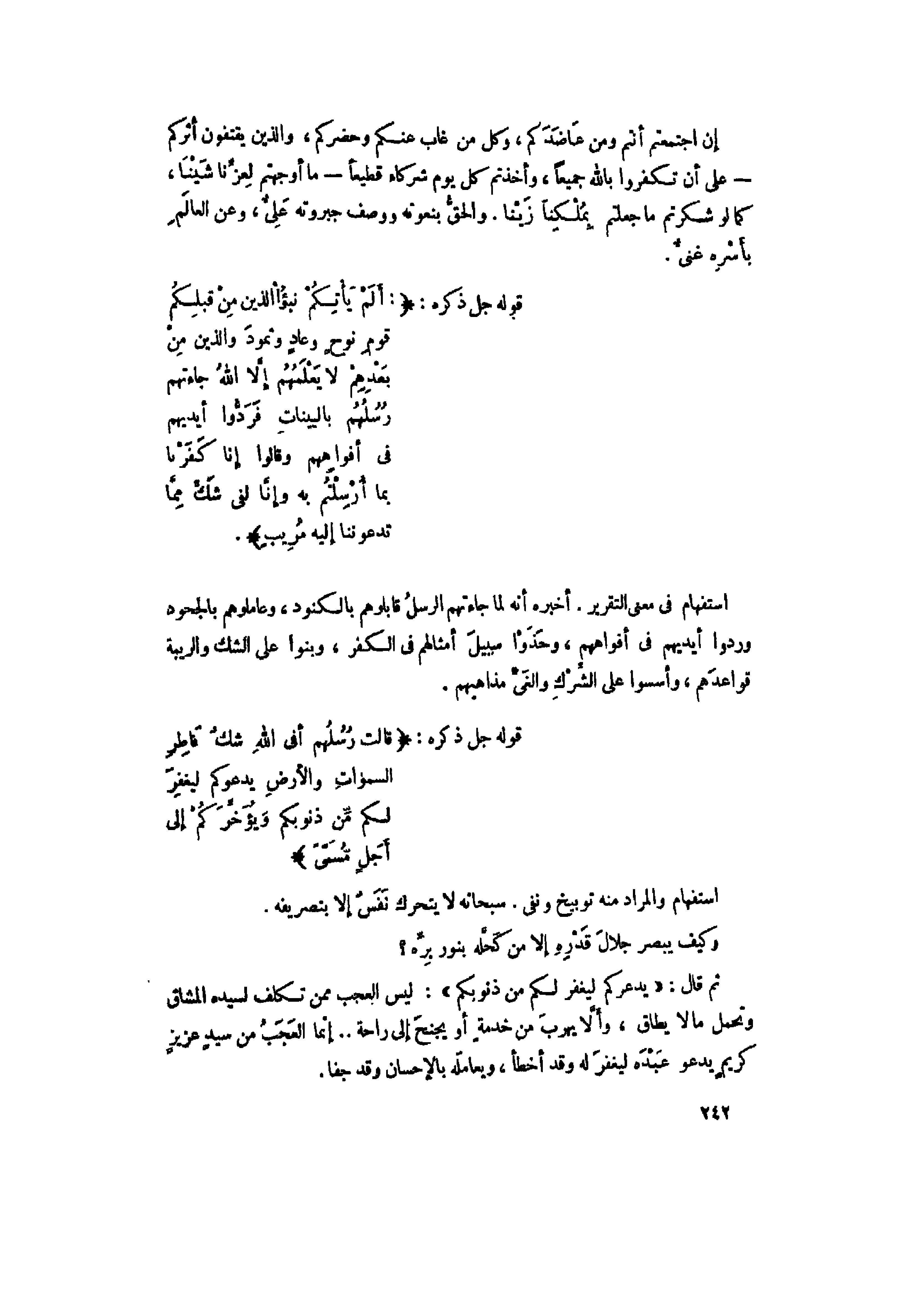 إن اجتمعتم أنتم ومن عاضدكم، وكل من غاب عنكم وحضركم، والذين يقتفون أثركم- على أن تكفروا بالله جميعا، وأخذتم كل يوم شركاء قطيعا- ما أوجهتم لعزّنا شينا، كما لو شكرتم ما جعلتم بملكنا زينا. والحقّ بنعوته ووصف جبروته علىّ، وعن العالم بأسره غنىّ.