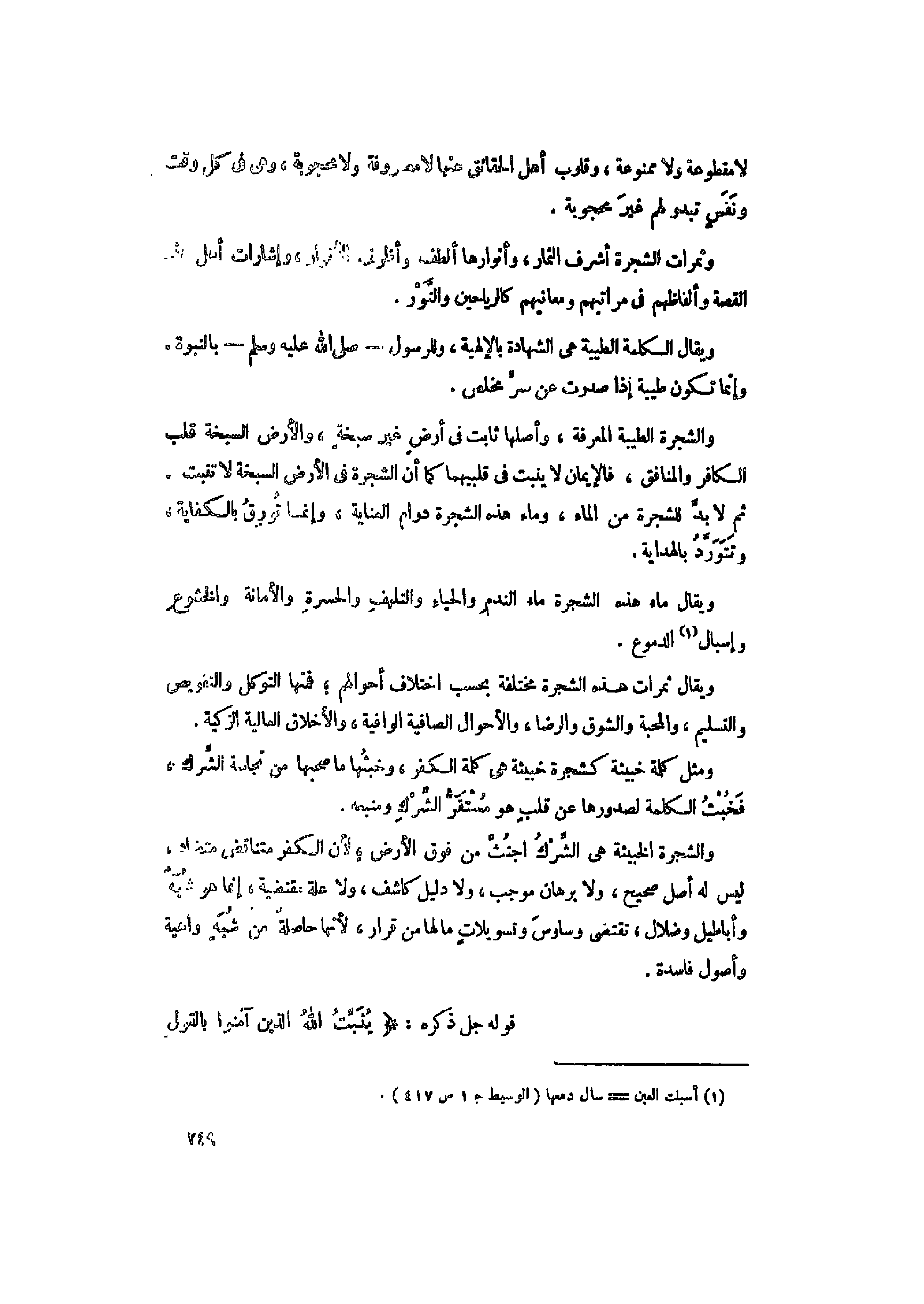 والشجرة الطيبة المعرفة، وأصلها ثابت فى أرض غير سبخة، والأرض السبخة قلب الكافر والمنافق، فالإيمان لا ينبت فى قلبيهما كما أن الشجرة فى الأرض السبخة لا تنبت.