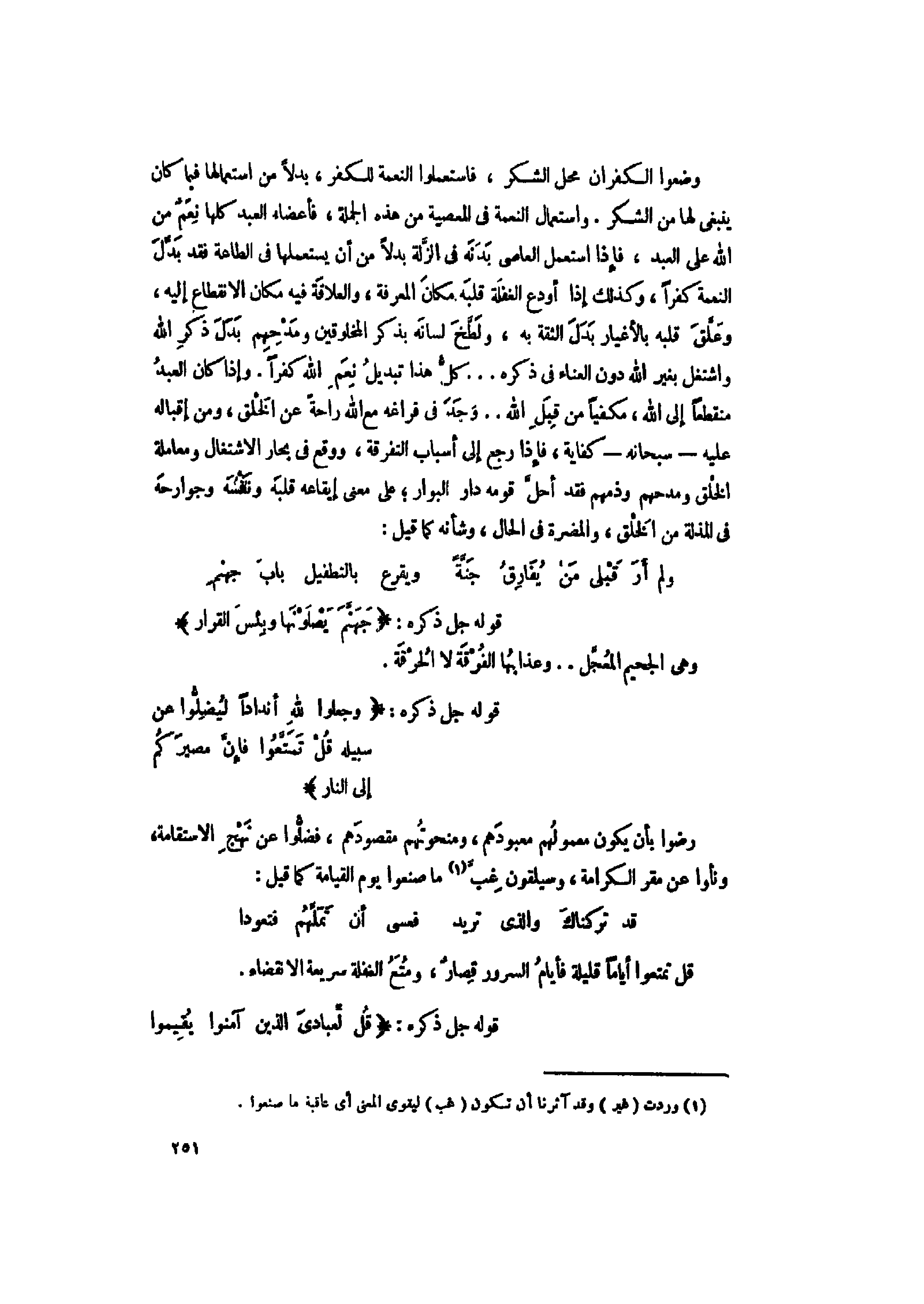 وضعوا الكفران محل الشكر، فاستعملوا النعمة للكفر، بدلا من استعمالها فيما كان ينبغى لها من الشكر. واستعمال النعمة فى المعصية من هذه الجملة، فأعضاء العبد كلها نعم من الله على العبد، فإذا استعمل العاصي بدنه فى الزّلة بدلا من أن يستعملها فى الطاعة فقد بدّل النعمة كفرا، وكذلك إذا أودع الغفلة قلبه مكان المعرفة، والعلاقة فيه مكان الانقطاع إليه، وعلّق قلبه بالأغيار بدل الثقة به، ولطّخ لسانه بذكر المخلوقين ومدحهم بدل ذكر الله واشتغل بغير الله دون العناء فى ذكره ... كلّ هذا تبديل نعم الله كفرا. وإذا كان العبد منقطعا إلى الله، مكفيا من قبل الله.. وجد فى فراغه مع الله راحة عن الخلق، ومن إقباله عليه- سبحانه- كفاية، فإذا رجع إلى أسباب التفرقة، ووقع فى بحار الاشتغال ومعاملة الخلق ومدحهم وذمهم فقد أحلّ قومه دار البوار على معنى إيقاعه قلبه ونفسه وجوارحه فى المذلة من الخلق، والمضرة فى الحال، وشأنه كما قيل: