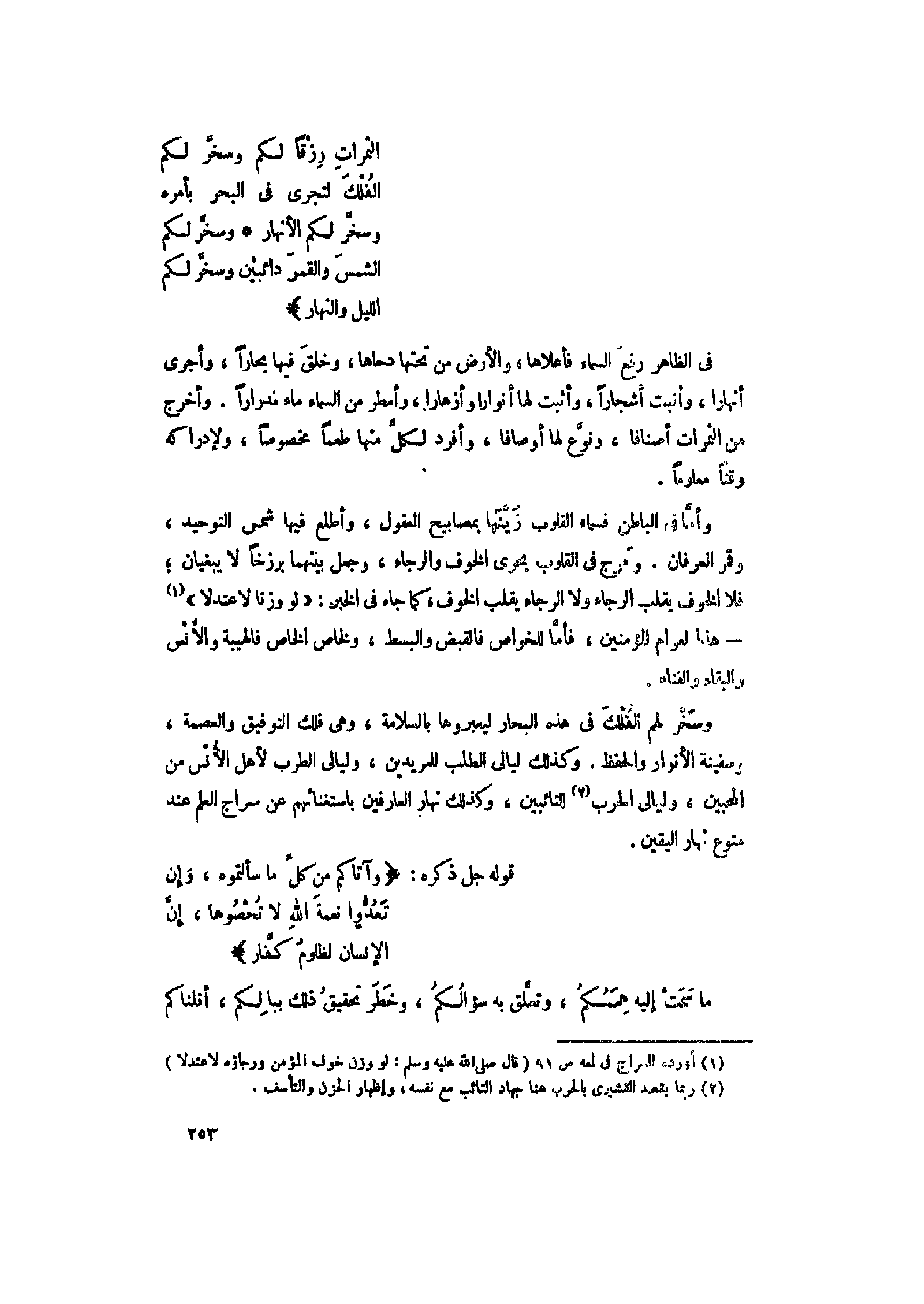 وسخّر لهم الفلك فى هذه البحار ليعبروها بالسلامة، وهى فلك التوفيق والعصمة، وسفينة الأنوار والحفظ. وكذلك ليالى الطلب للمريدين، وليالى الطرب لأهل الأنس من المحبين، وليالى الحرب «2» للتائبين، وكذلك نهار العارفين باستغنائهم عن سراج العلم عند متوع نهار اليقين.