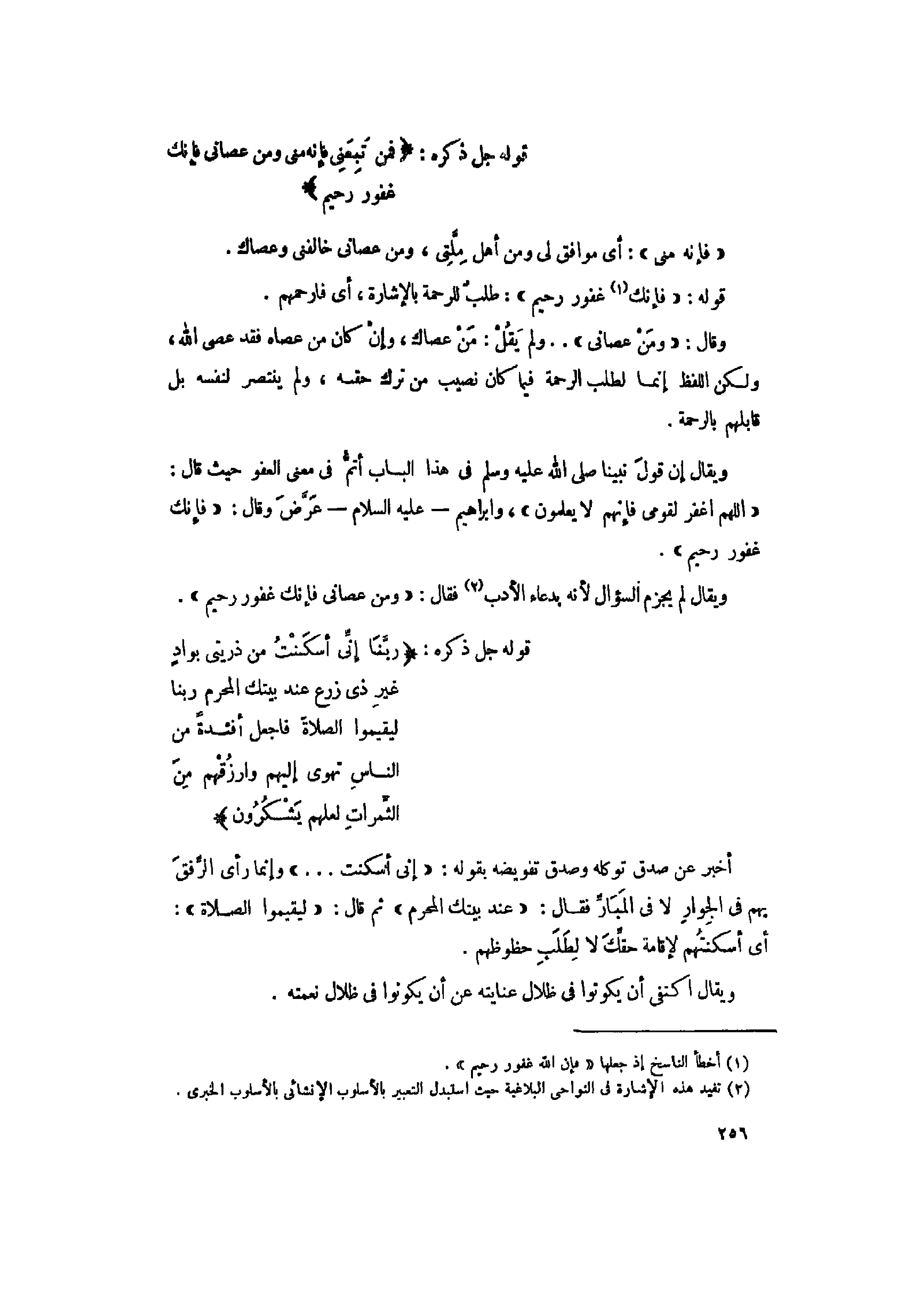 وقال: «وَمَنْ عَصانِي» .. ولم يقل: من عصاك، وإن كان من عصاه فقد عصى الله، ولكن اللفظ إنما لطلب الرحمة فيما كان نصيب من ترك حقه، ولم ينتصر لنفسه بل قابلهم بالرحمة.