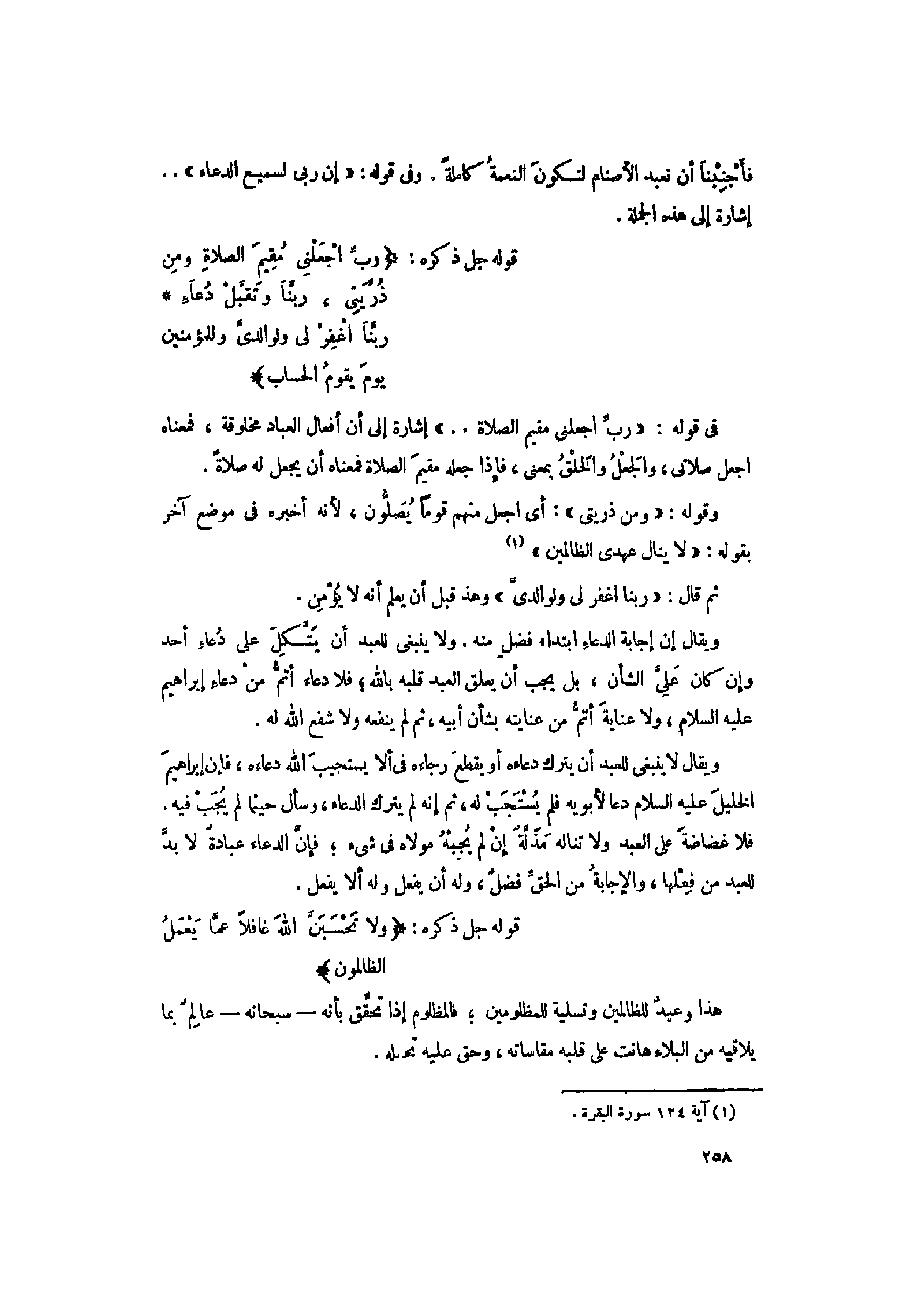 وقوله: «وَمِنْ ذُرِّيَّتِي» : أي اجعل منهم قوما يصلّون، لأنه أخبره فى موضع آخر بقوله: «لا يَنالُ عَهْدِي الظَّالِمِينَ» «1» ثم قال: «رَبَّنَا اغْفِرْ لِي وَلِوالِدَيَّ» وهذ قبل أن يعلم أنه لا يؤمن.
