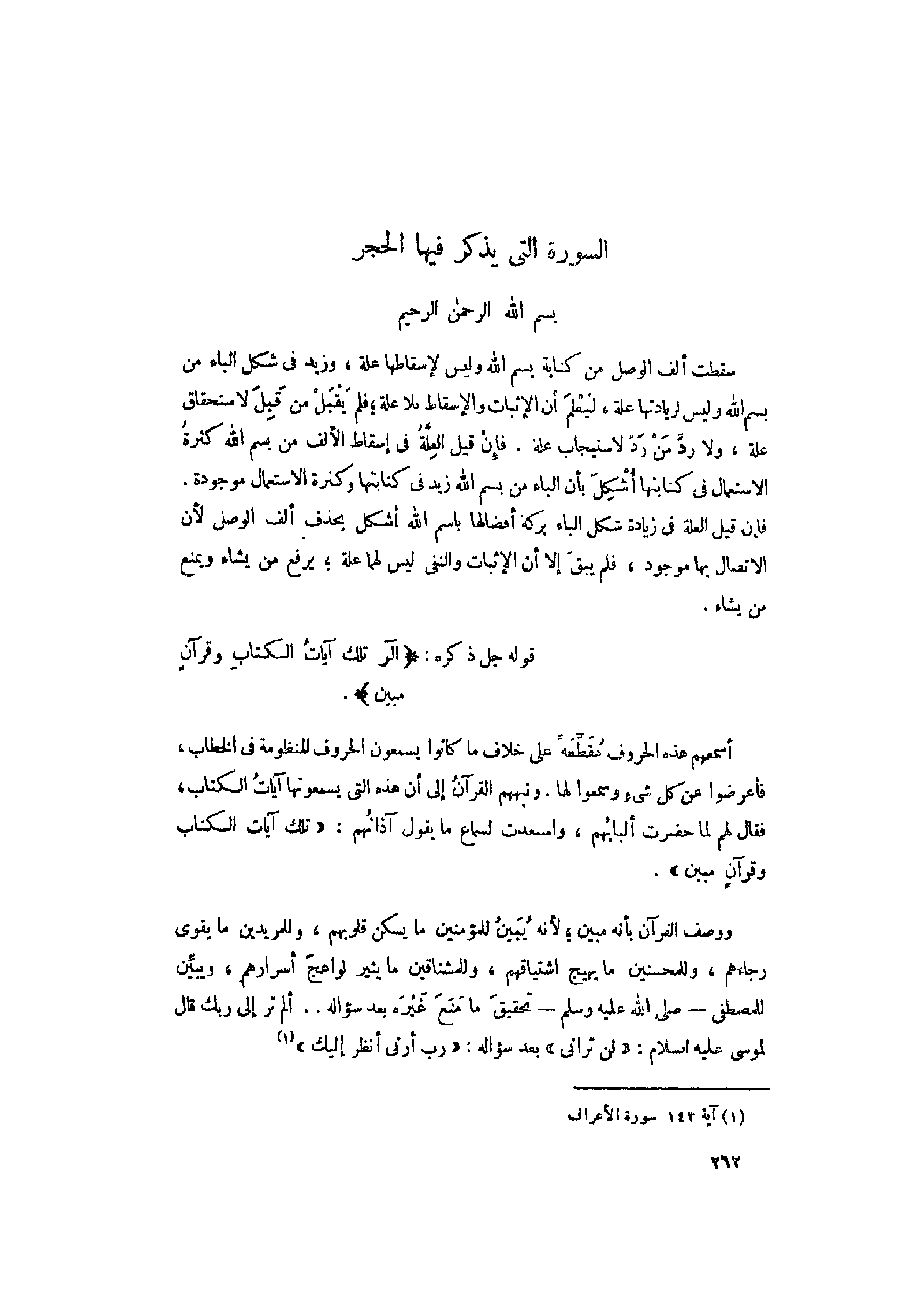 بسم الله الرحمن الرحيم سقطت ألف الوصل من كتابة بسم الله وليس لإسقاطها علة، وزيد فى شكل الباء من بسم الله وليس لزيادتها علة، ليعلم أن الإثبات والإسقاط بلا علة فلم يقبل من قبل لاستحقاق علة، ولا ردّ من ردّ لاستيجاب علة. فإن قيل العلّة فى إسقاط الألف من بسم الله كثرة الاستعمال فى كتابتها أشكل بأن الباء من بسم الله زيد فى كتابتها وكثرة الاستعمال موجودة.