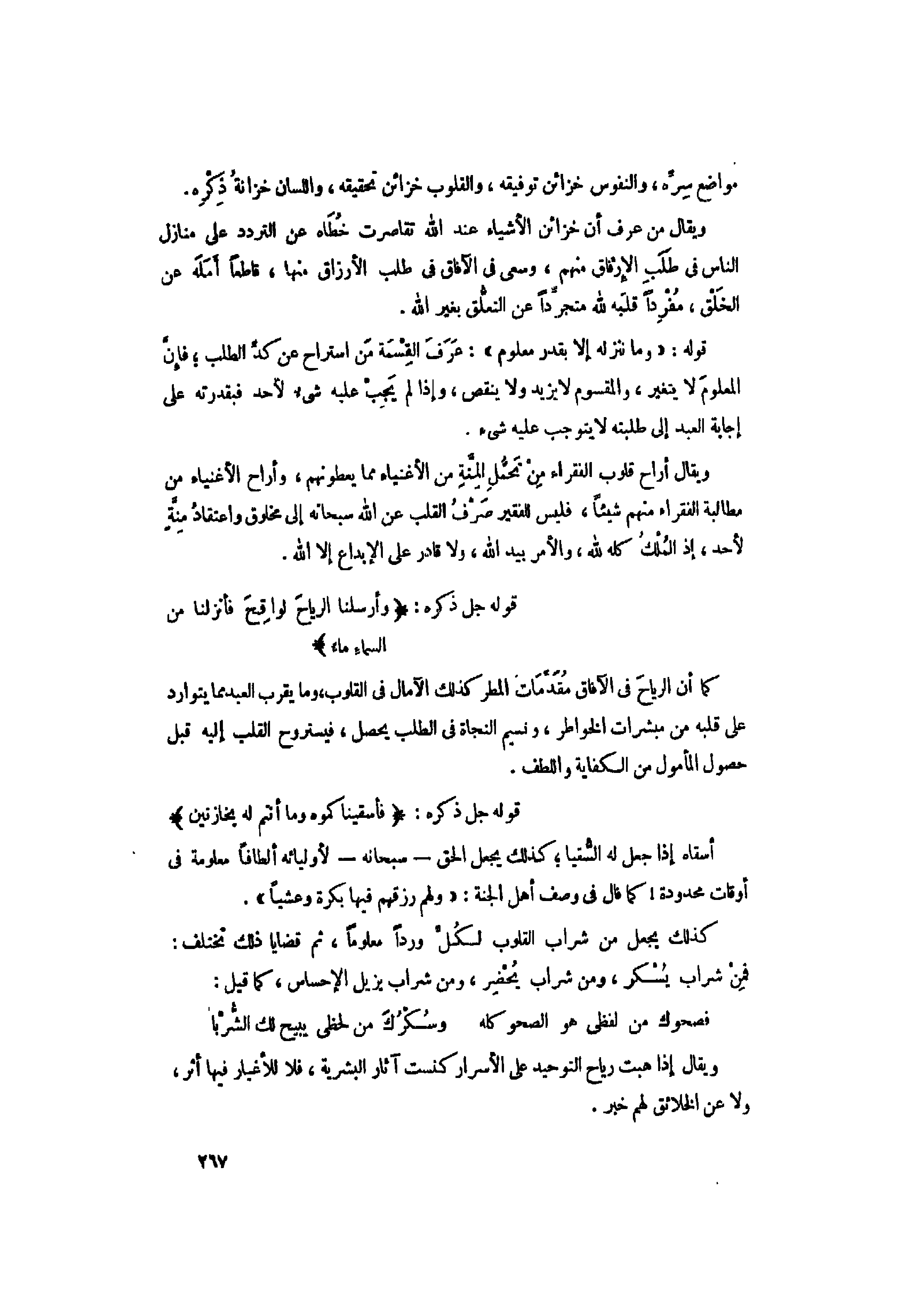 ويقال من عرف أن خزائن الأشياء عند الله تقاصرت خطاه عن التردد على منازل الناس فى طلب الإرفاق منهم، وسعى فى الآفاق فى طلب الأرزاق منها، قاطعا أمله عن الخلق، مفردا قلبه لله متجردا عن التعلّق بغير الله.