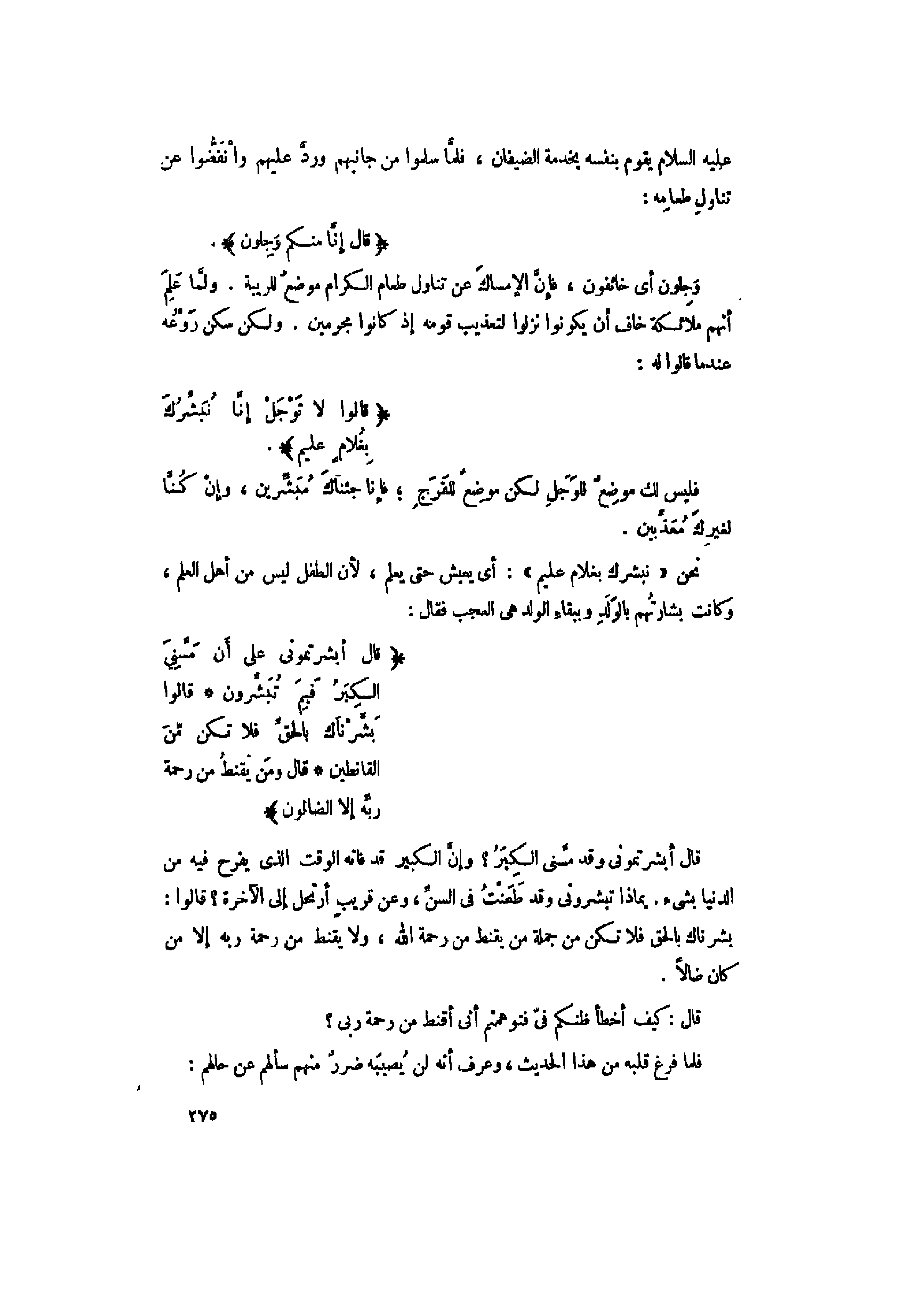 قالَ أَبَشَّرْتُمُونِي عَلى أَنْ مَسَّنِيَ الْكِبَرُ فَبِمَ تُبَشِّرُونَ (54) قالُوا بَشَّرْناكَ بِالْحَقِّ فَلا تَكُنْ مِنَ الْقانِطِينَ (55) قالَ وَمَنْ يَقْنَطُ مِنْ رَحْمَةِ رَبِّهِ إِلاَّ الضَّالُّونَ (56)