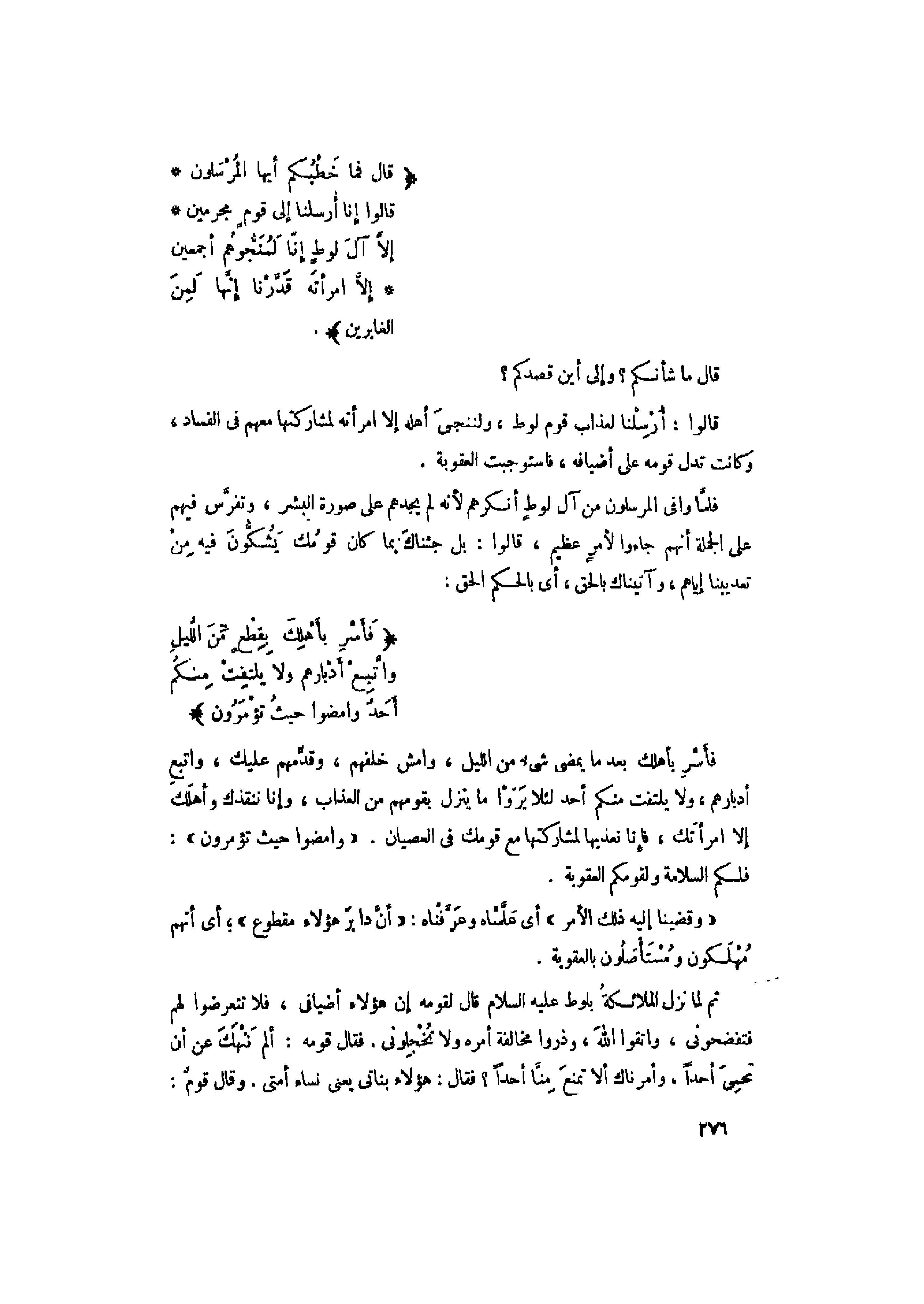 قالَ فَما خَطْبُكُمْ أَيُّهَا الْمُرْسَلُونَ (57) قالُوا إِنَّا أُرْسِلْنا إِلى قَوْمٍ مُجْرِمِينَ (58) إِلاَّ آلَ لُوطٍ إِنَّا لَمُنَجُّوهُمْ أَجْمَعِينَ (59) إِلاَّ امْرَأَتَهُ قَدَّرْنا إِنَّها لَمِنَ الْغابِرِينَ (60)
