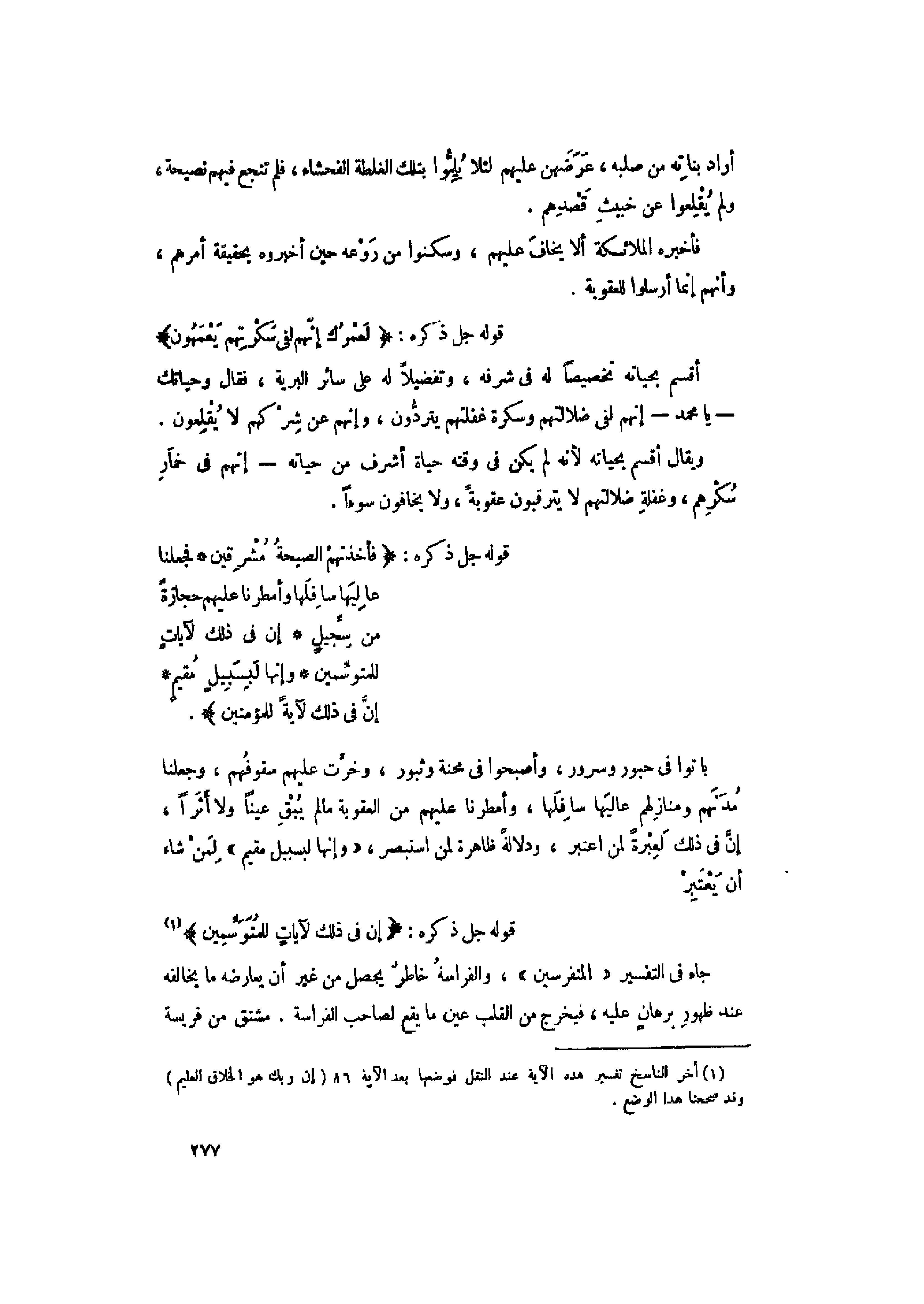 باتوا فى حبور وسرور، وأصبحوا فى محنة وثبور، وخرّت عليهم سقوفهم، وجعلنا مدنهم ومنازلهم عاليها سافلها، وأمطرنا عليهم من العقوبة مالم يبق عينا ولا أثرا، إنّ فى ذلك لعبرة لمن اعتبر، ودلالة ظاهرة لمن استبصر، «وَإِنَّها لَبِسَبِيلٍ مُقِيمٍ» لمن شاء أن يعتبر قوله جل ذكره: إِنَّ فِي ذلِكَ لَآياتٍ لِلْمُتَوَسِّمِينَ «1» جاء فى التفسير «المتفرسين» ، والفراسة خاطر يحصل من غير أن يعارضه ما يخالفه عند ظهور برهان عليه، فيخرج من القلب عين ما يقع لصاحب الفراسة. مشتق من فريسة