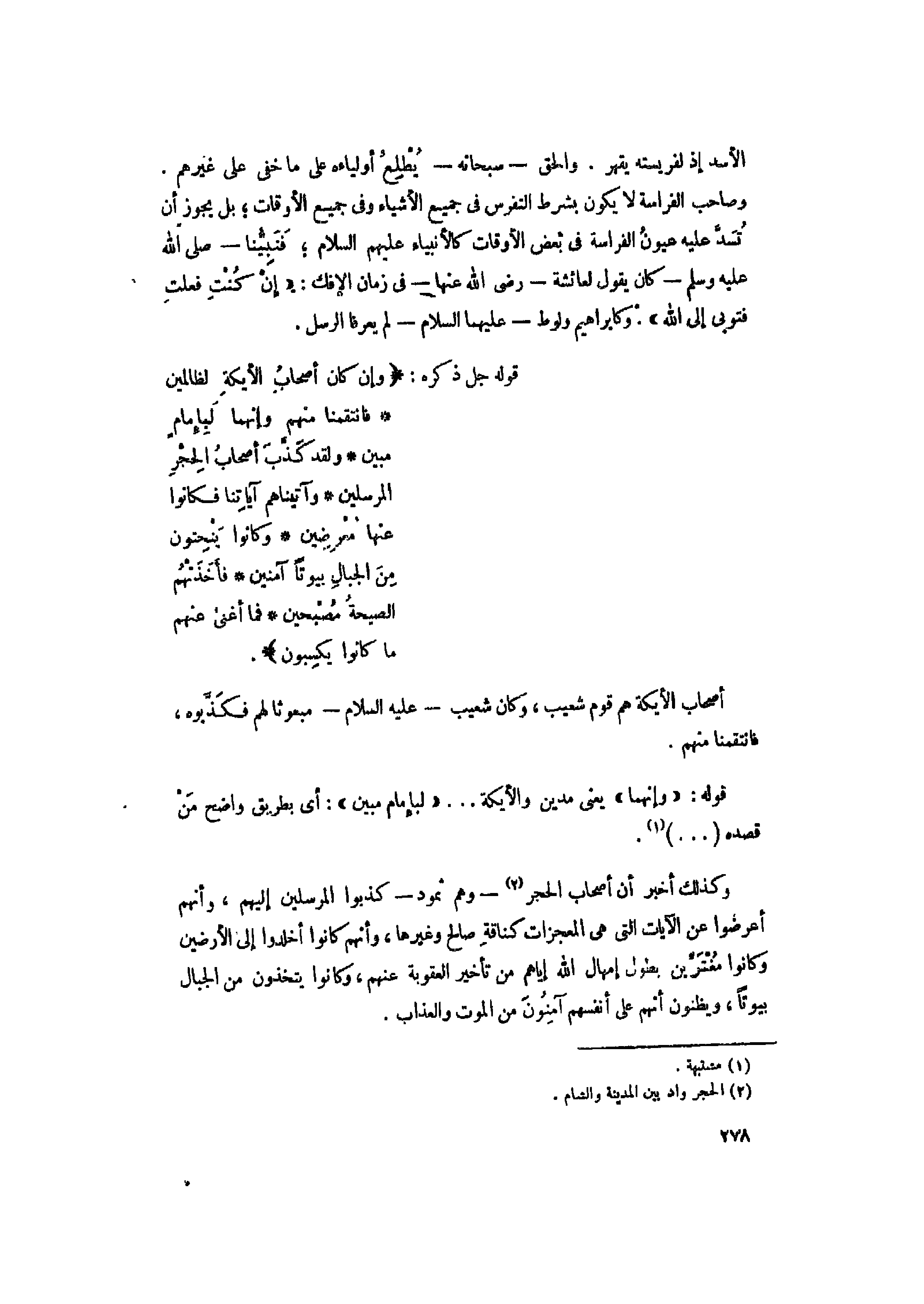 وَإِنْ كانَ أَصْحابُ الْأَيْكَةِ لَظالِمِينَ (78) فَانْتَقَمْنا مِنْهُمْ وَإِنَّهُما لَبِإِمامٍ مُبِينٍ (79) وَلَقَدْ كَذَّبَ أَصْحابُ الْحِجْرِ الْمُرْسَلِينَ (80) وَآتَيْناهُمْ آياتِنا فَكانُوا عَنْها مُعْرِضِينَ (81) وَكانُوا يَنْحِتُونَ مِنَ الْجِبالِ بُيُوتاً آمِنِينَ (82)
