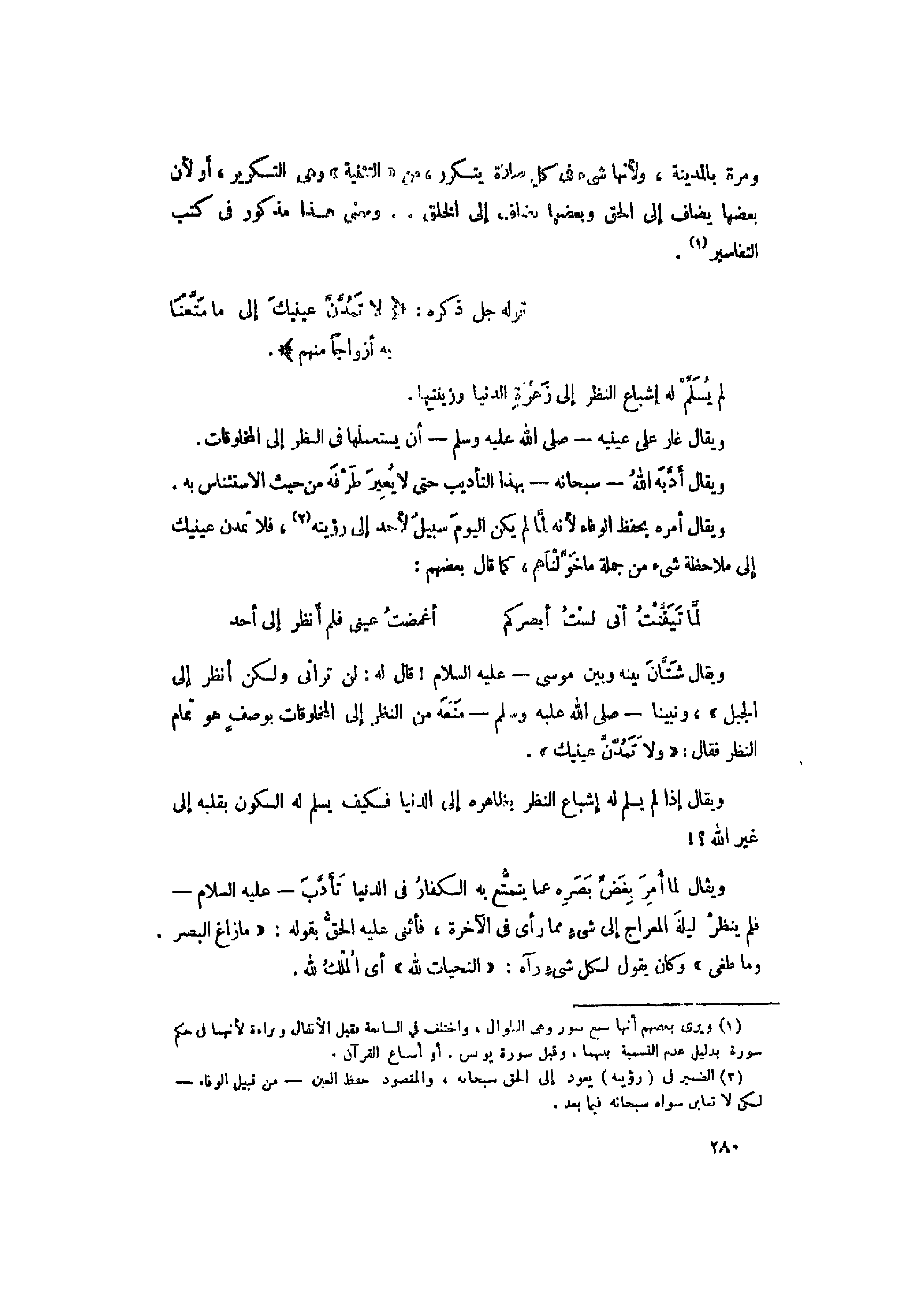 ويقال إذا لم يلم له إشباع النظر بظاهره إلى الدنيا فكيف يسلم له السكون بقلبه إلى غير الله؟! ويقال لما أمر بغضّ بصره عما يتمتّع به الكفار فى الدنيا تأدّب- عليه السلام- فلم ينظر ليلة المعراج إلى شىء مما رأى فى الآخرة، فأثنى عليه الحقّ بقوله: «ما زاغَ الْبَصَرُ. وَما طَغى» وكان يقول لكل شىء رآه: «التحيات لله» أي الملك لله.