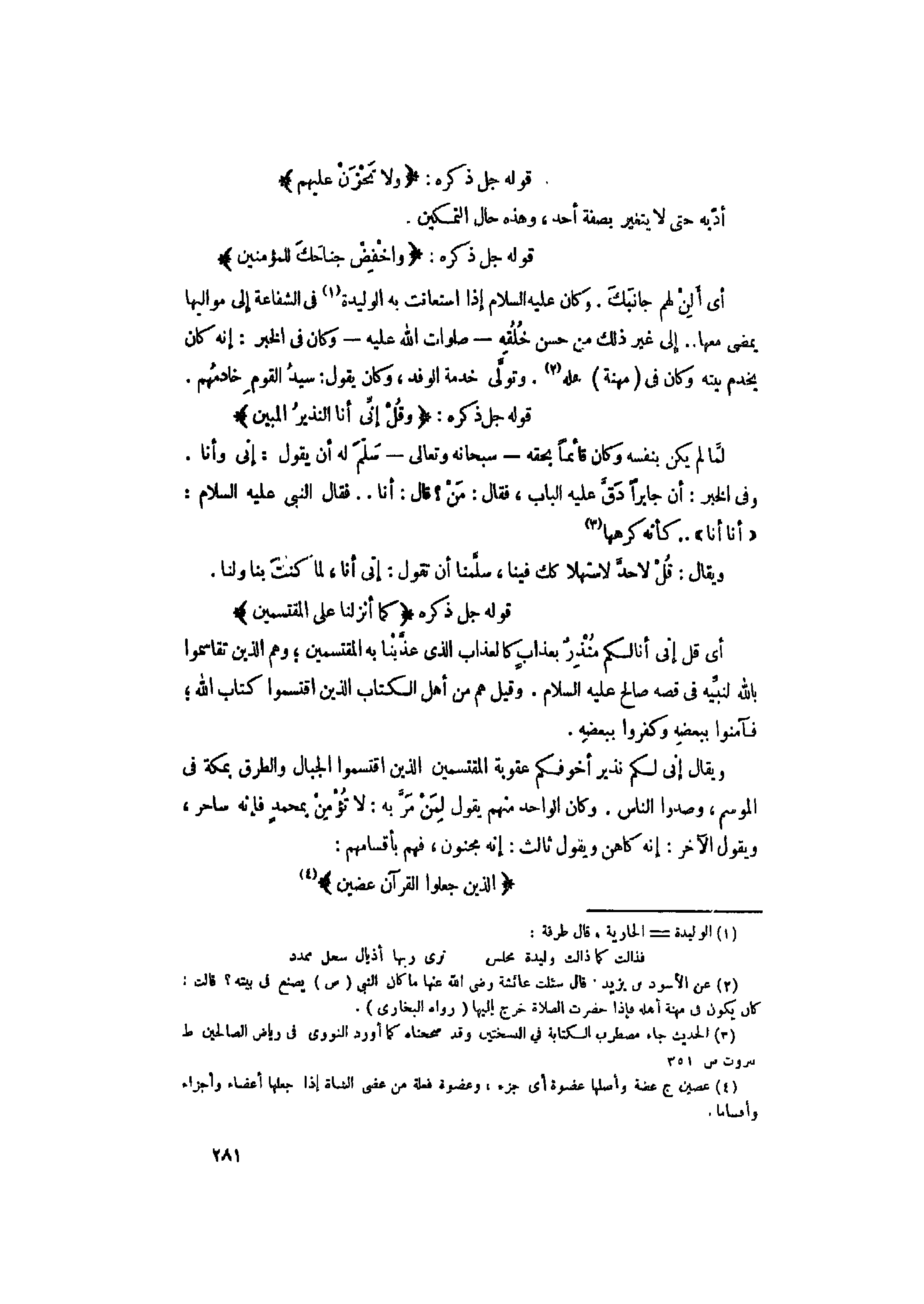 ويقال إنى لكم نذير أخوفكم عقوبة المقتسمين الذين اقتسموا الجبال والطرق بمكة فى الموسم، وصدوا الناس. وكان الواحد منهم يقول لمن مرّ به: لا تؤمن بمحمد فإنه ساحر، ويقول الآخر: إنه كاهن ويقول ثالث: إنه مجنون، فهم بأقسامهم: